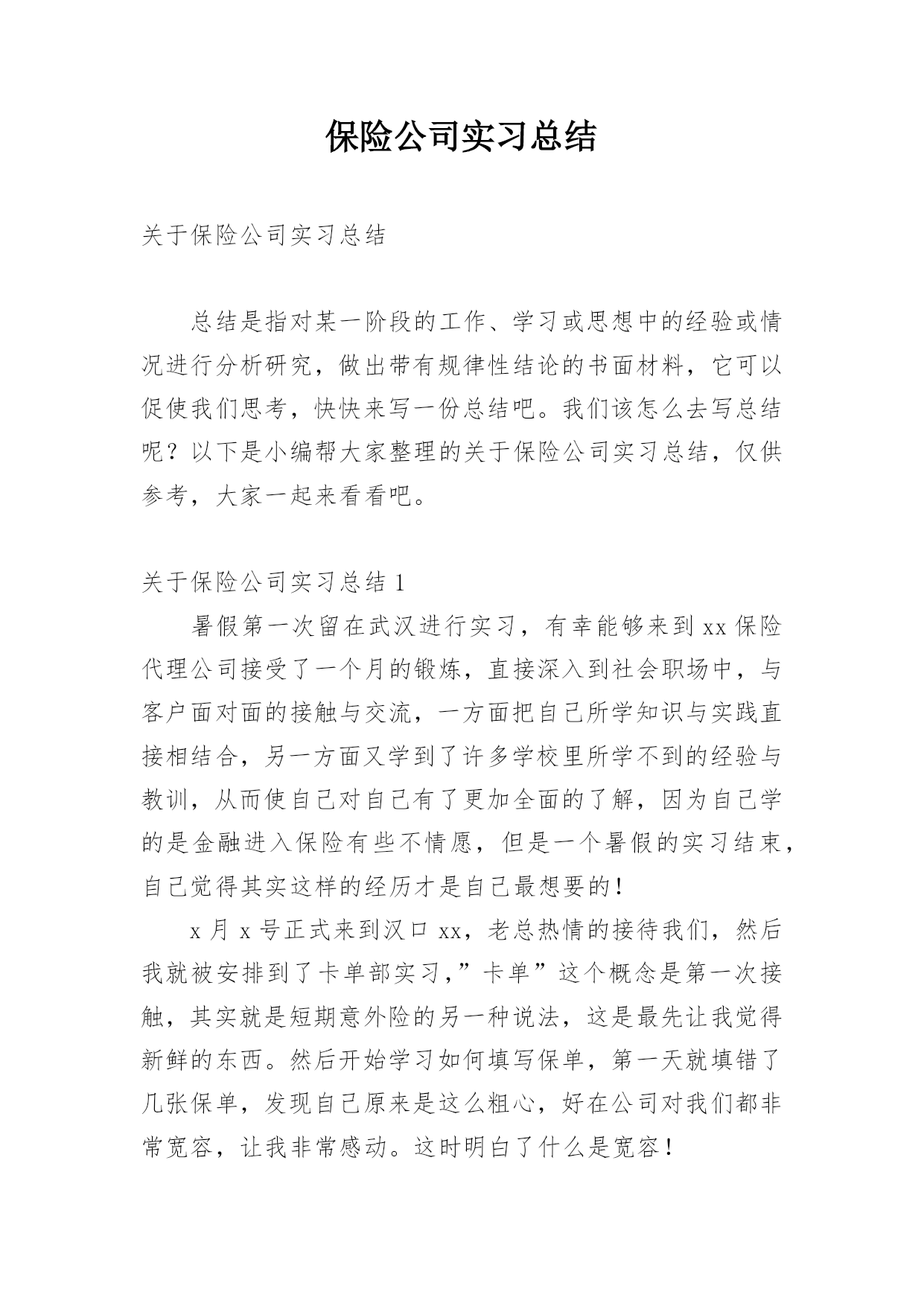保险公司实习总结关于保险公司实习总结总结是指对某一阶段的工作、学习或思想中的经验或情况进行分析研究,做出带有规律性结论的书面材料,它可以促使我们思考,快快来写一份总结吧。我们该怎么去写总结呢?以下是小编帮大家整理的关于保险公司实习总结,仅供参考,大家一起来看看吧。关于保险公司实习总结1暑假第一次留在武汉进行实习,有幸能够来到xx保险代理公司接受了一个月的锻炼,直接深入到社会职场中,与客户面对面的接触与交流,一方面把自己所学知识与实践直接相结合,另一方面又学到了许多学校里所学不到的经验与教训,从而使自己对自