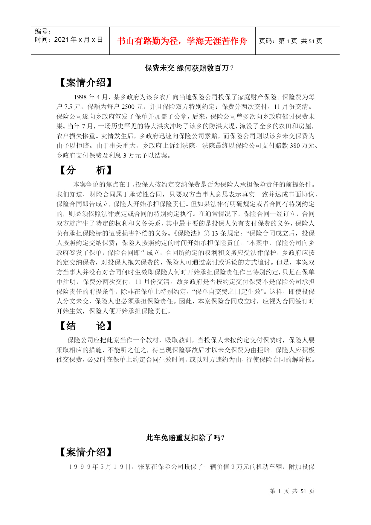 编号:时间:2021年x月x日书山有路勤为径,学海无涯苦作舟页码:第PAGE51页共NUMPAGES51页第PAGE\*MERGEFORMAT51页共NUMPAGES\*MERGEFORMAT51页保费未交缘何获赔数百万?【案情介绍】1998年4月,某乡政府为该乡农户向当地保险公司投保了家庭财产保险。保险费为每户7.5元,保额为每户2500元,并且保险双方特别约定:保费分两次交付,11月份交清。保险公司遂向乡政府签发了保单并加盖了公章。后来,保险公司曾多次向乡政府催讨保费未果。当年