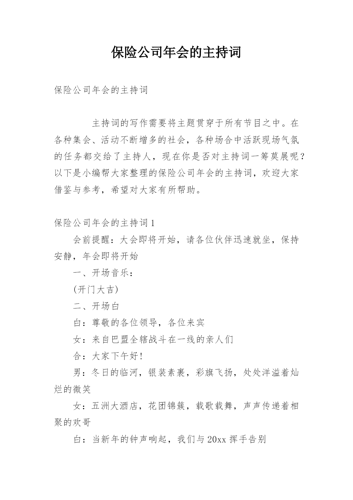保险公司年会的主持词保险公司年会的主持词主持词的写作需要将主题贯穿于所有节目之中。在各种集会、活动不断增多的社会,各种场合中活跃现场气氛的任务都交给了主持人,现在你是否对主持词一筹莫展呢?以下是小编帮大家整理的保险公司年会的主持词,欢迎大家借鉴与参考,希望对大家有所帮助。保险公司年会的主持词1会前提醒:大会即将开始,请各位伙伴迅速就坐,保持安静,年会即将开始一、开场音乐:(开门大吉)二、开场白白:尊敬的各位领导,各位来宾女:来自巴盟全辖战斗在一线的亲人们合:大家下午好!男:冬日的临河,银装素裹,彩旗飞扬,