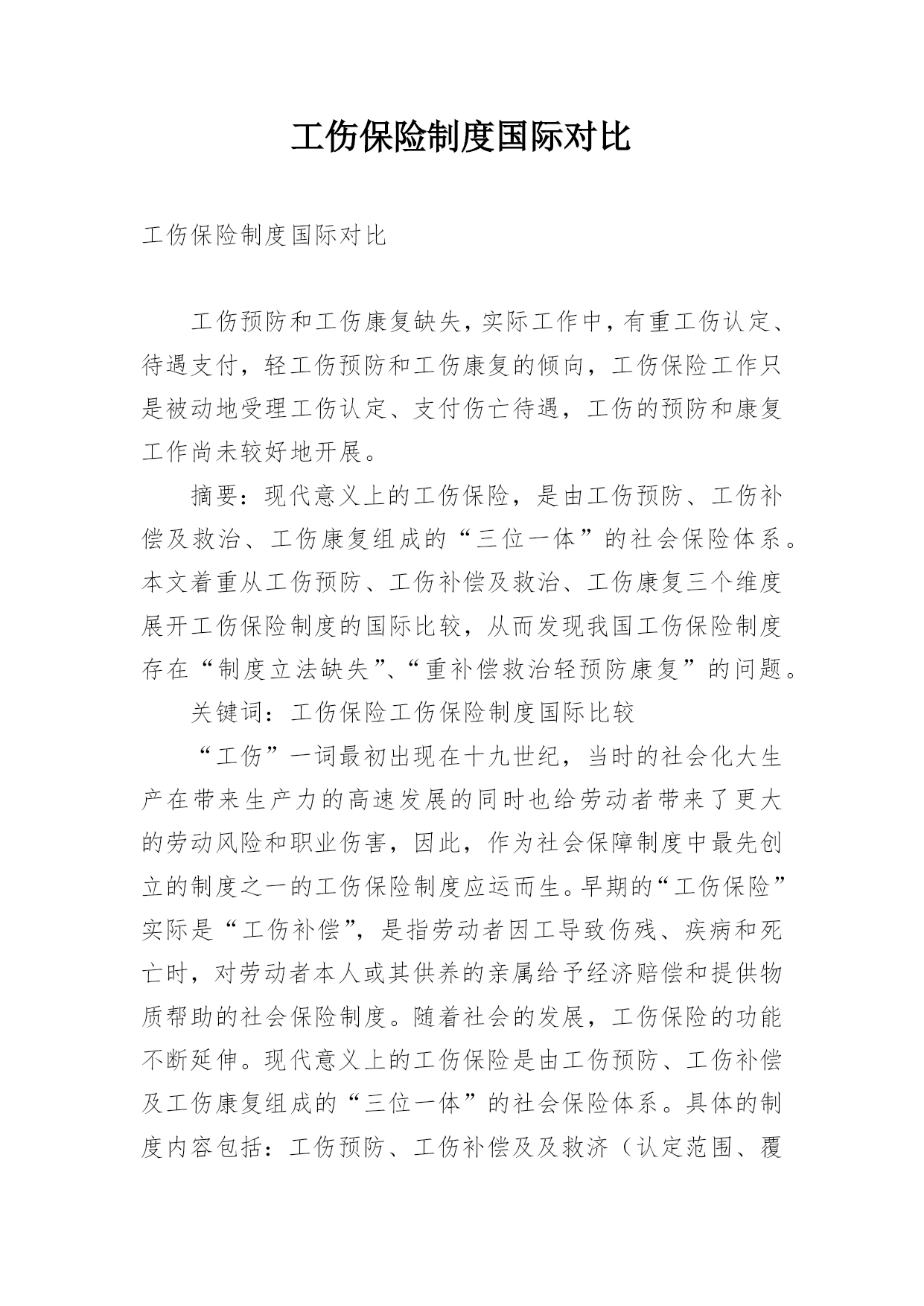 工伤保险制度国际对比工伤保险制度国际对比工伤预防和工伤康复缺失,实际工作中,有重工伤认定、待遇支付,轻工伤预防和工伤康复的倾向,工伤保险工作只是被动地受理工伤认定、支付伤亡待遇,工伤的预防和康复工作尚未较好地开展。摘要:现代意义上的工伤保险,是由工伤预防、工伤补偿及救治、工伤康复组成的“三位一体”的社会保险体系。本文着重从工伤预防、工伤补偿及救治、工伤康复三个维度展开工伤保险制度的国际比较,从而发现我国工伤保险制度存在“制度立法缺失”、“重补偿救治轻预防康复”的问题。关键词:工伤保险工伤保险制度国际比较“