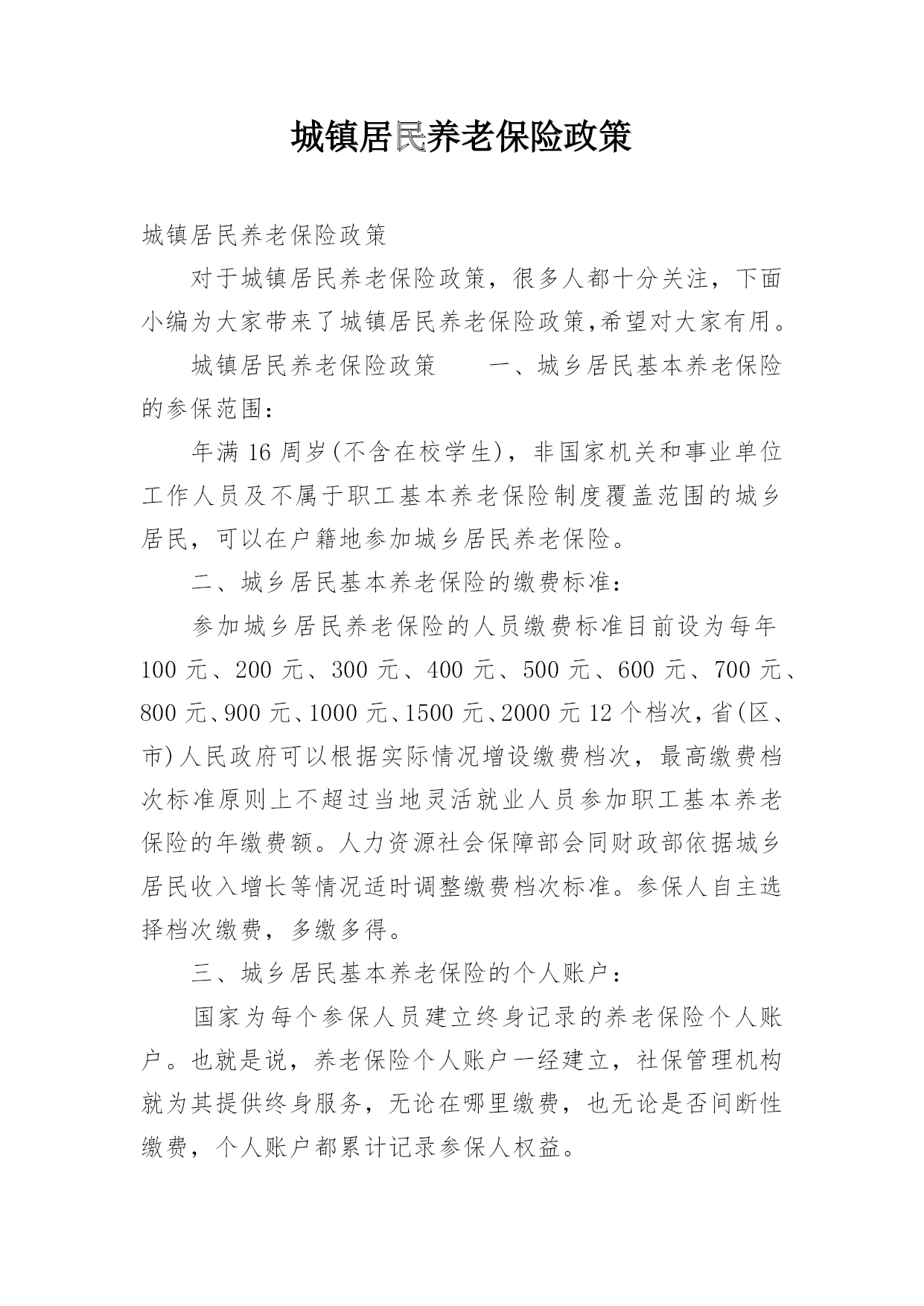 城镇居民养老保险政策城镇居民养老保险政策对于城镇居民养老保险政策,很多人都十分关注,下面小编为大家带来了城镇居民养老保险政策,希望对大家有用。城镇居民养老保险政策一、城乡居民基本养老保险的参保范围:年满16周岁(不含在校学生),非国家机关和事业单位工作人员及不属于职工基本养老保险制度覆盖范围的城乡居民,可以在户籍地参加城乡居民养老保险。二、城乡居民基本养老保险的缴费标准:参加城乡居民养老保险的人员缴费标准目前设为每年100元、200元、300元、400元、500元、600元、700元、800元、900元、