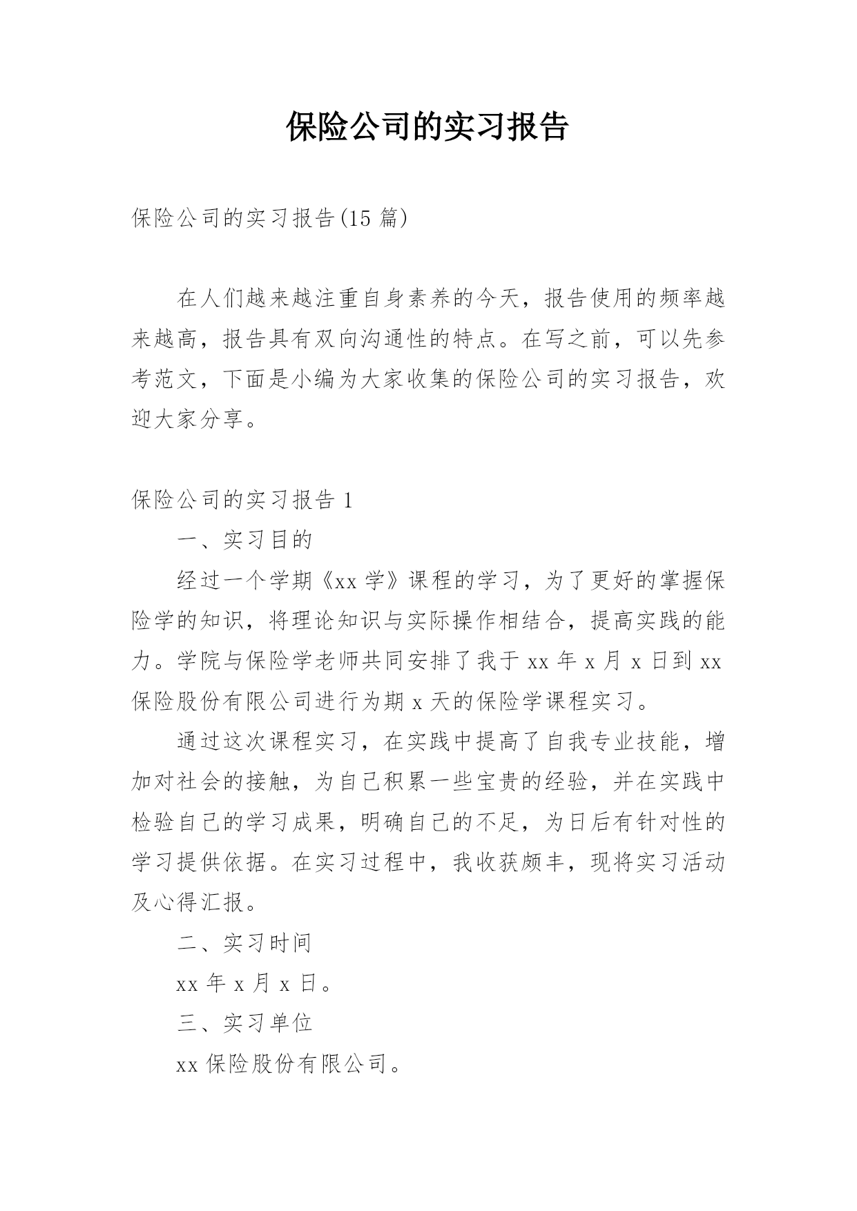 保险公司的实习报告保险公司的实习报告(15篇)在人们越来越注重自身素养的今天,报告使用的频率越来越高,报告具有双向沟通性的特点。在写之前,可以先参考范文,下面是小编为大家收集的保险公司的实习报告,欢迎大家分享。保险公司的实习报告1一、实习目的经过一个学期《xx学》课程的学习,为了更好的掌握保险学的知识,将理论知识与实际操作相结合,提高实践的能力。学院与保险学老师共同安排了我于xx年x月x日到xx保险股份有限公司进行为期x天的保险学课程实习。通过这次课程实习,在实践中提高了自我专业技能,增加对社会的接触,为