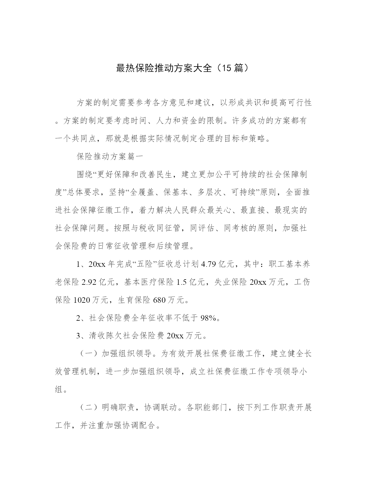 最热保险推动方案大全(15篇)方案的制定需要参考各方意见和建议,以形成共识和提高可行性。方案的制定要考虑时间、人力和资金的限制。许多成功的方案都有一个共同点,那就是根据实际情况制定合理的目标和策略。保险推动方案篇一围绕“更好保障和改善民生,建立更加公平可持续的社会保障制度”总体要求,坚持“全履盖、保基本、多层次、可持续”原则,全面推进社会保障征缴工作,着力解决人民群众最关心、最直接、最现实的社会保障问题。按照与税收同征管,同评估、同考核的原则,加强社会保险费的日常征收管理和后续管理。1、20xx年完成“五