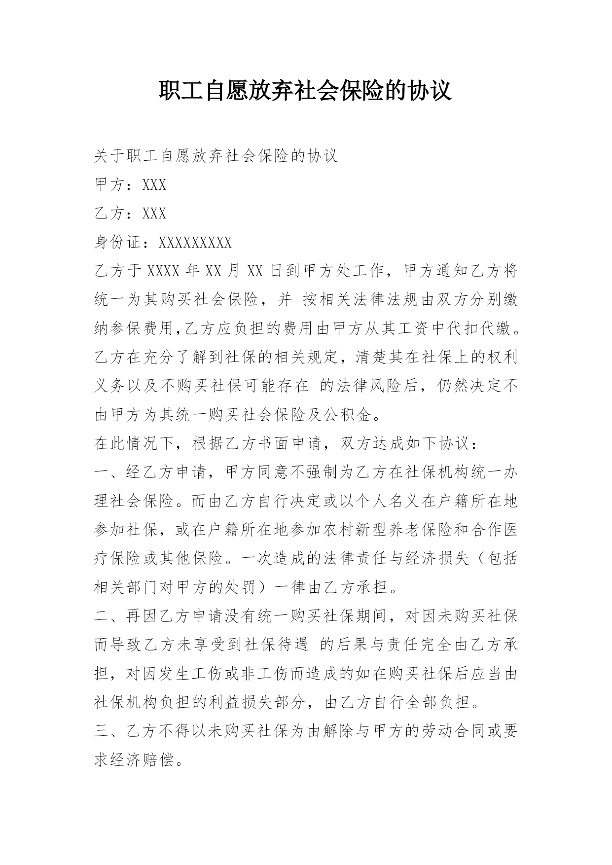 职工自愿放弃社会保险的协议关于职工自愿放弃社会保险的协议甲方:XXX乙方:XXX身份证:XXXXXXXXX乙方于XXXX年XX月XX日到甲方处工作,甲方通知乙方将统一为其购买社会保险,并按相关法律法规由双方分别缴纳参保费用,乙方应负担的费用由甲方从其工资中代扣代缴。乙方在充分了解到社保的相关规定,清楚其在社保上的权利义务以及不购买社保可能存在的法律风险后,仍然决定不由甲方为其统一购买社会保险及公积金。在此情况下,根据乙方书面申请,双方达成如下协议:一、经乙方申请,甲方同意不强制为乙方在社保机构统一办理社会