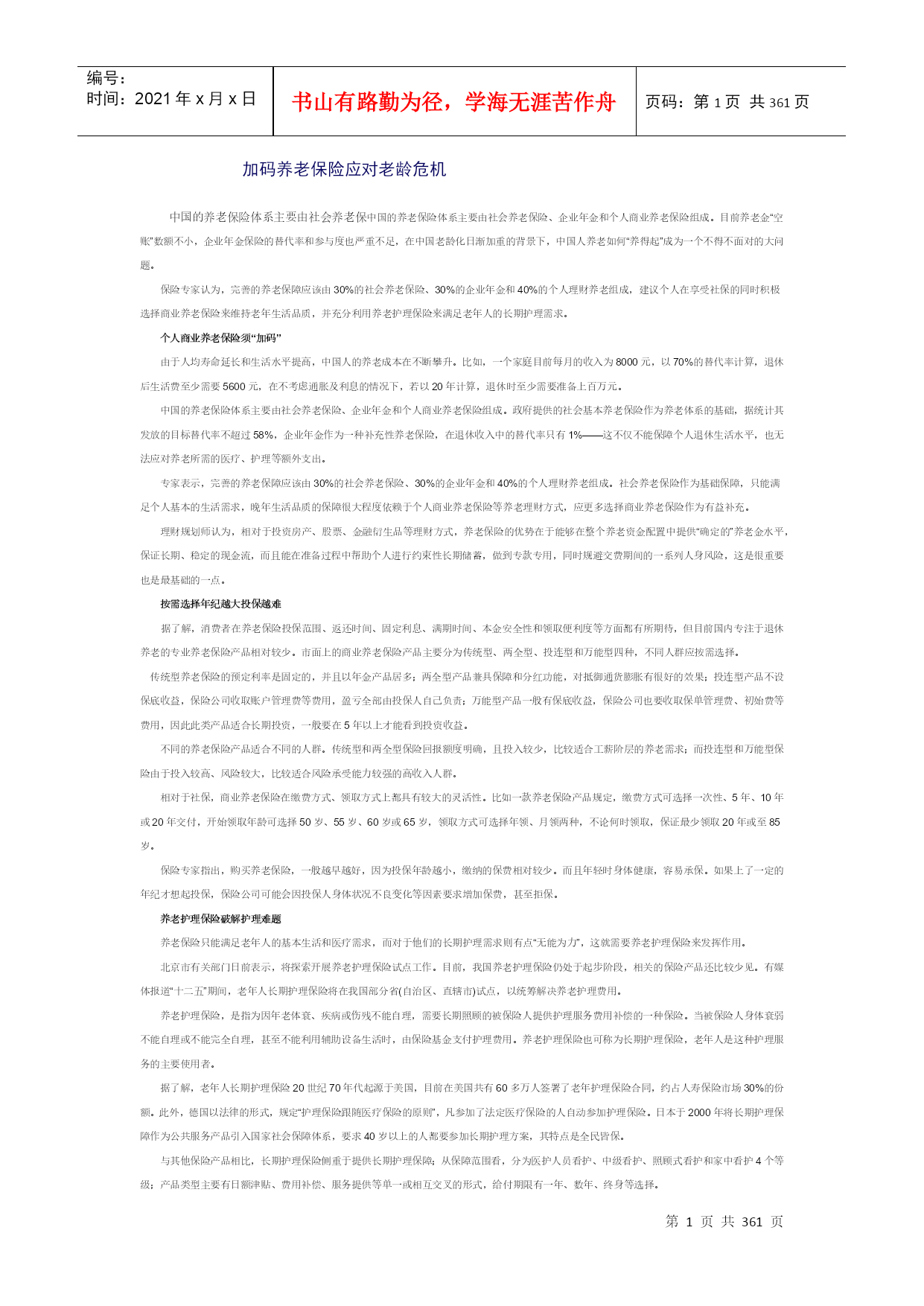 编号:时间:2021年x月x日书山有路勤为径,学海无涯苦作舟页码:第PAGE361页共NUMPAGES361页第PAGE\*MERGEFORMAT361页共NUMPAGES\*MERGEFORMAT361页加码养老保险应对老龄危机中国的养老保险体系主要由社会养老保中国的养老保险体系主要由社会养老保险、企业年金和个人商业养老保险组成。目前养老金“空账”数额不小,企业年金保险的替代率和参与度也严重不足,在中国老龄化日渐加重的背景下,中国人养老如何“养得起”成为一个不得不面对的大问题。保