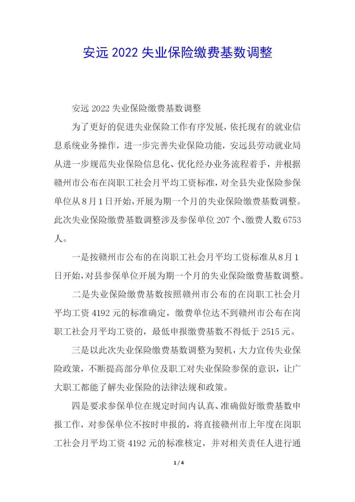 PAGE4/NUMPAGES4安远2022失业保险缴费基数调整安远2022失业保险缴费基数调整为了更好的促进失业保险工作有序发展,依托现有的就业信息系统业务操作,进一步完善失业保险功能,安远县劳动就业局从进一步规范失业保险信息化、优化经办业务流程着手,并根据赣州市公布在岗职工社会月平均工资标准,对全县失业保险参保单位从8月1日开始,开展为期一个月的失业保险缴费基数调整。此次失业保险缴费基数调整涉及参保单位207个、缴费人数6753人。一是按赣州市公布的在岗职工社会月平均工资标准从8月1日开始,
