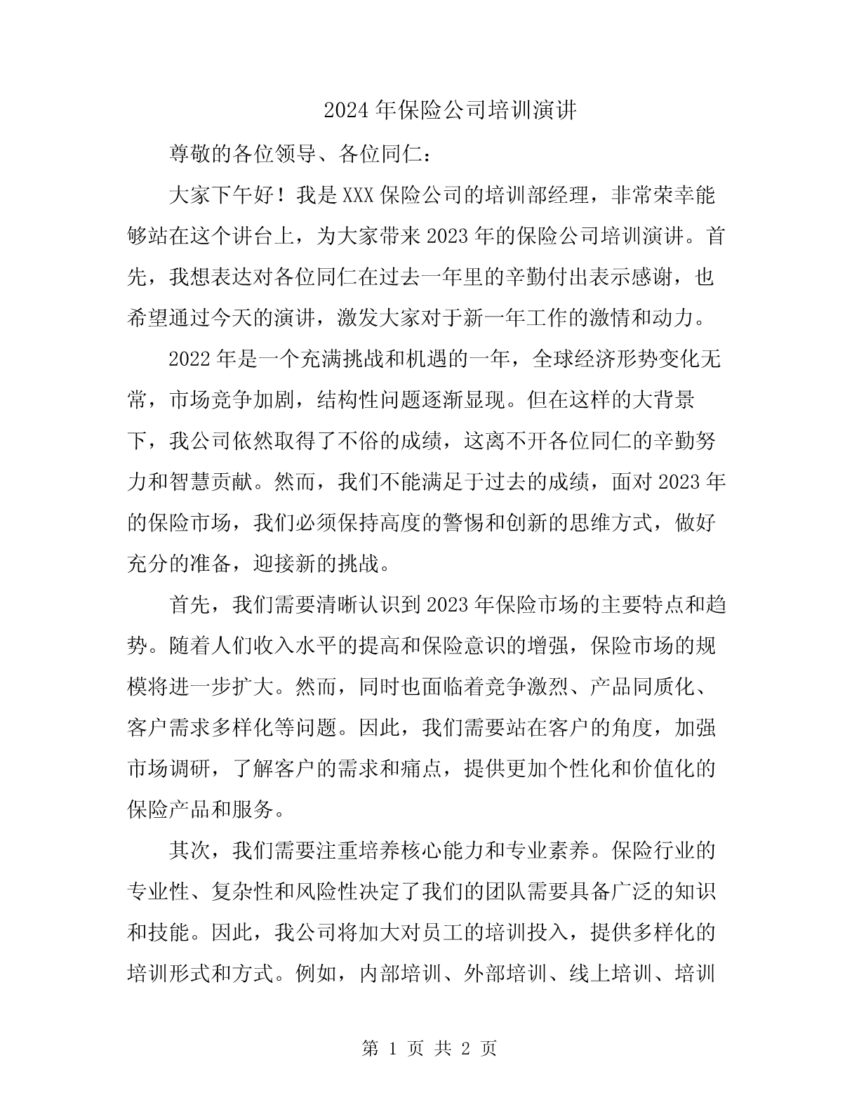 2024年保险公司培训演讲尊敬的各位领导、各位同仁:大家下午好!我是XXX保险公司的培训部经理,非常荣幸能够站在这个讲台上,为大家带来2023年的保险公司培训演讲。首先,我想表达对各位同仁在过去一年里的辛勤付出表示感谢,也希望通过今天的演讲,激发大家对于新一年工作的激情和动力。2022年是一个充满挑战和机遇的一年,全球经济形势变化无常,市场竞争加剧,结构性问题逐渐显现。但在这样的大背景下,我公司依然取得了不俗的成绩,这离不开各位同仁的辛勤努力和智慧贡献。然而,我们不能满足于过去的成绩,面对2023年的保险