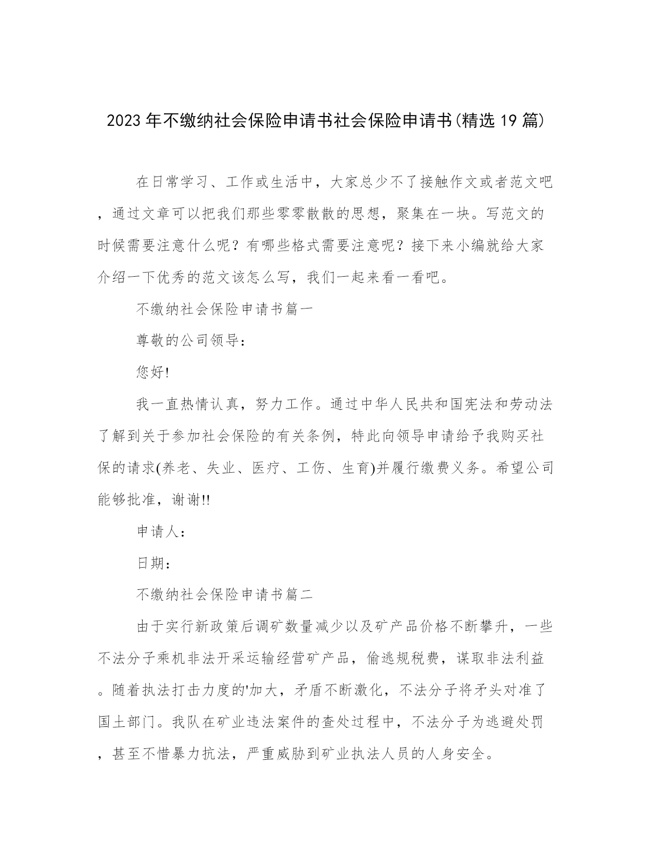 2023年不缴纳社会保险申请书社会保险申请书(精选19篇).docx