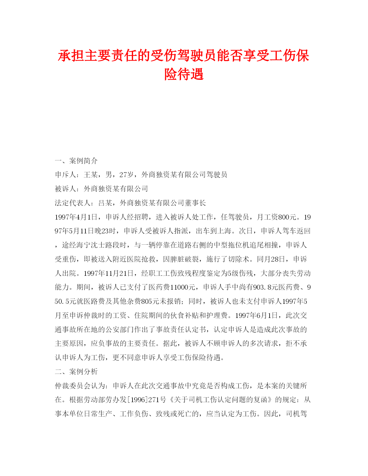 此资料由网络收集而来,如有侵权请告知上传者立即删除。资料共分享,我们负责传递知识。承担主要责任的受伤驾驶员能否享受工伤保险待遇一、案例简介申斥人:王某,男,27岁,外商独资某有限公司驾驶员被诉人:外商独资某有限公司法定代表人:吕某,外商独资某有限公司董事长1997年4月1日,申诉人经招聘,进入被诉人处工作,任驾驶员,月工资800元。1997年5月11日晚23时,申诉人受被诉人指派,出车到上海。次日,申诉人驾车返回,途经海宁沈士路段时,与一辆停靠在道路右侧的中型拖位机追尾相撞,申诉人受重伤,即被送入附近医院