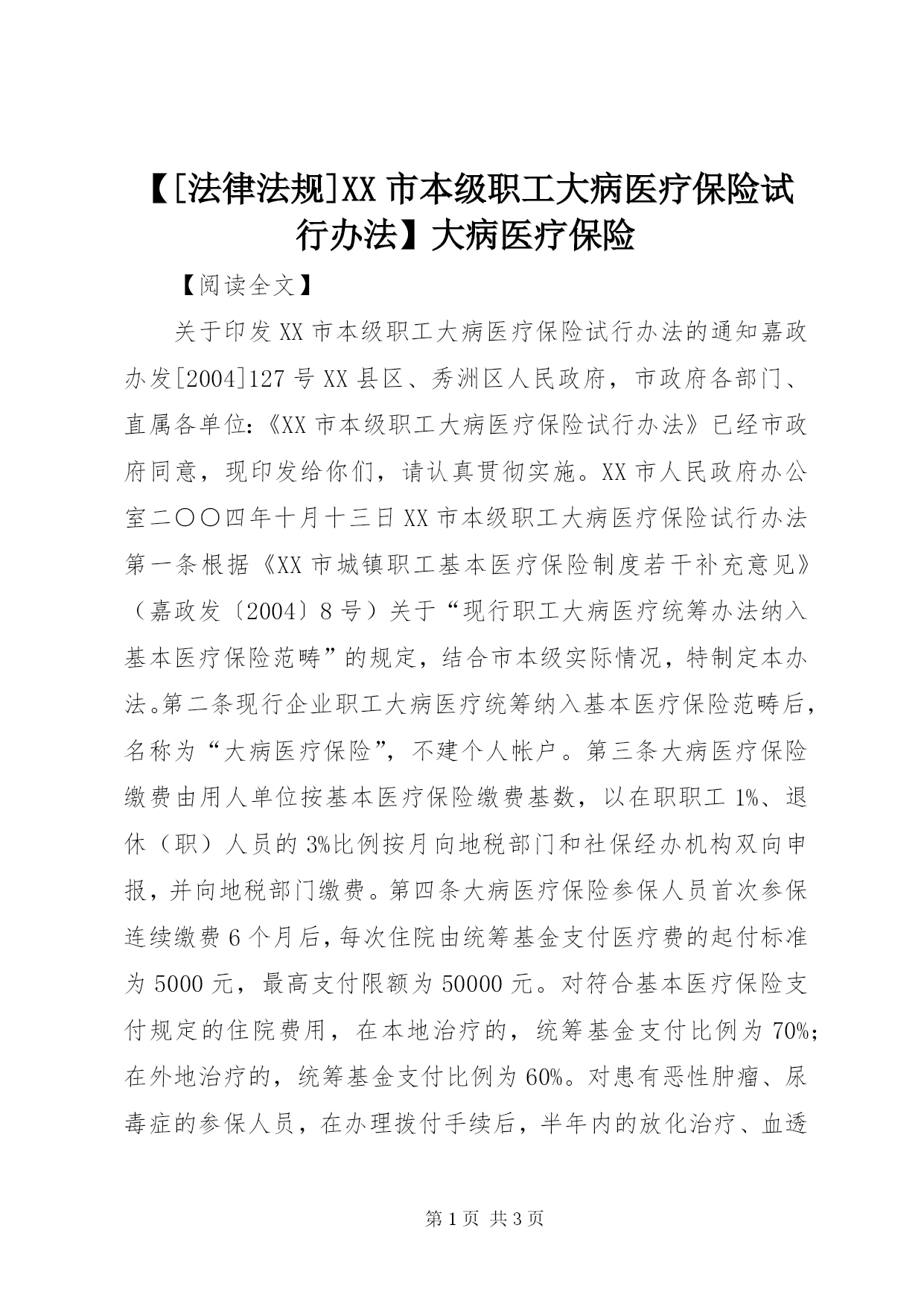 【[法律法规]XX市本级职工大病医疗保险试行办法】大病医疗保险.docx
