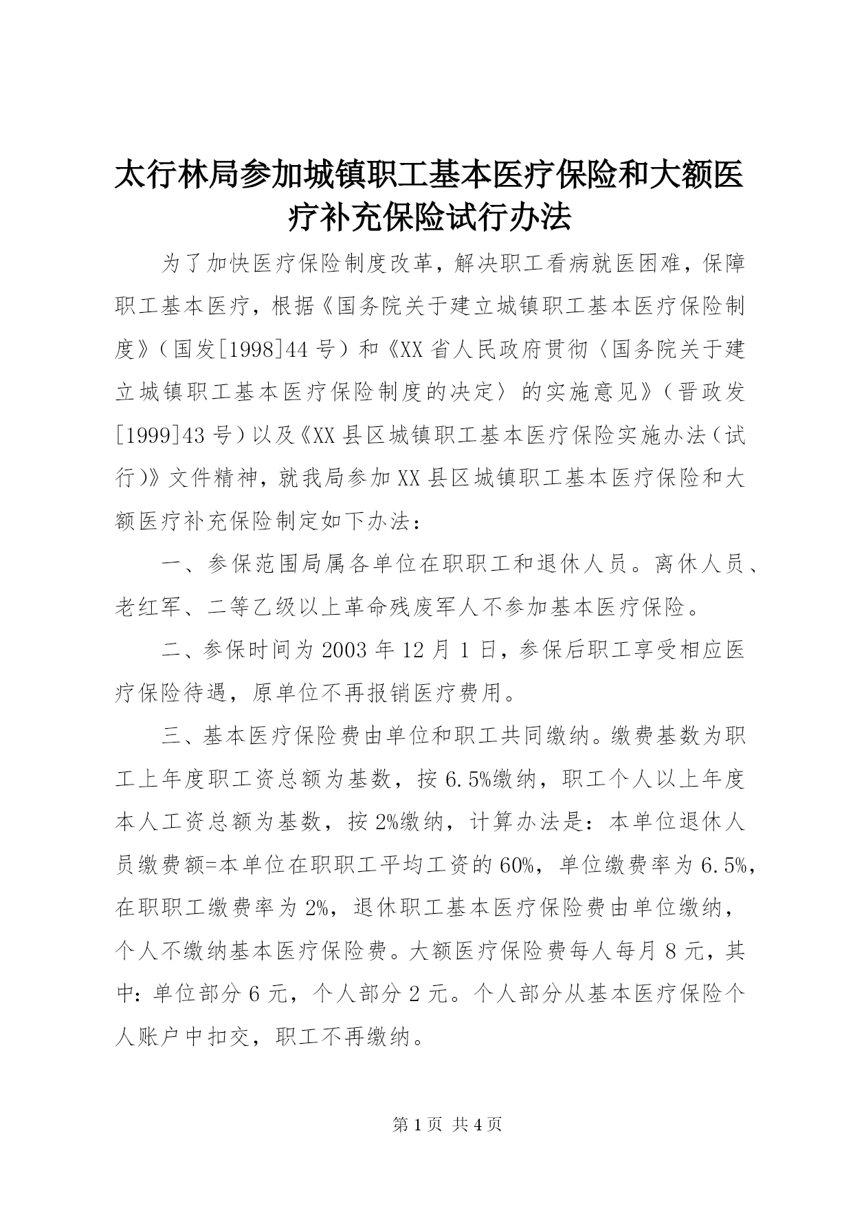 第PAGE\*Arabic\*MERGEFORMAT4页共NUMPAGES\*MERGEFORMAT4页太行林局参加城镇职工基本医疗保险和大额医疗补充保险试行办法为了加快医疗保险制度改革,解决职工看病就医困难,保障职工基本医疗,根据《国务院关于建立城镇职工基本医疗保险制度》(国发[1998]44号)和《XX省人民政府贯彻〈国务院关于建立城镇职工基本医疗保险制度的决定〉的实施意见》(晋政发[1999]43号)以及《XX县区城镇职工基本医疗保险实施办法(试行)》文件精神,就我局参加XX县区城镇职工