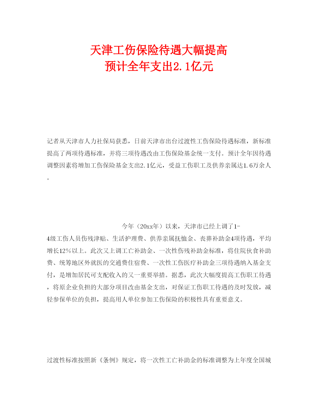 此资料由网络收集而来,如有侵权请告知上传者立即删除。资料共分享,我们负责传递知识。天津工伤保险待遇大幅提高预计全年支出2.1亿元记者从天津市人力社保局获悉,日前天津市出台过渡性工伤保险待遇标准,新标准提高了两项待遇标准,并将三项待遇改由工伤保险基金统一支付。预计全年因待遇调整因素将增加工伤保险基金支出2.1亿元,受益工伤职工及供养亲属达1.6万余人。今年(20xx年)以来,天津市已经上调了1-4级工伤人员伤残津贴、生活护理费、供养亲属抚恤金、丧葬补助金4项待遇,平均增长12%以上。此次又上调工亡补助金、一