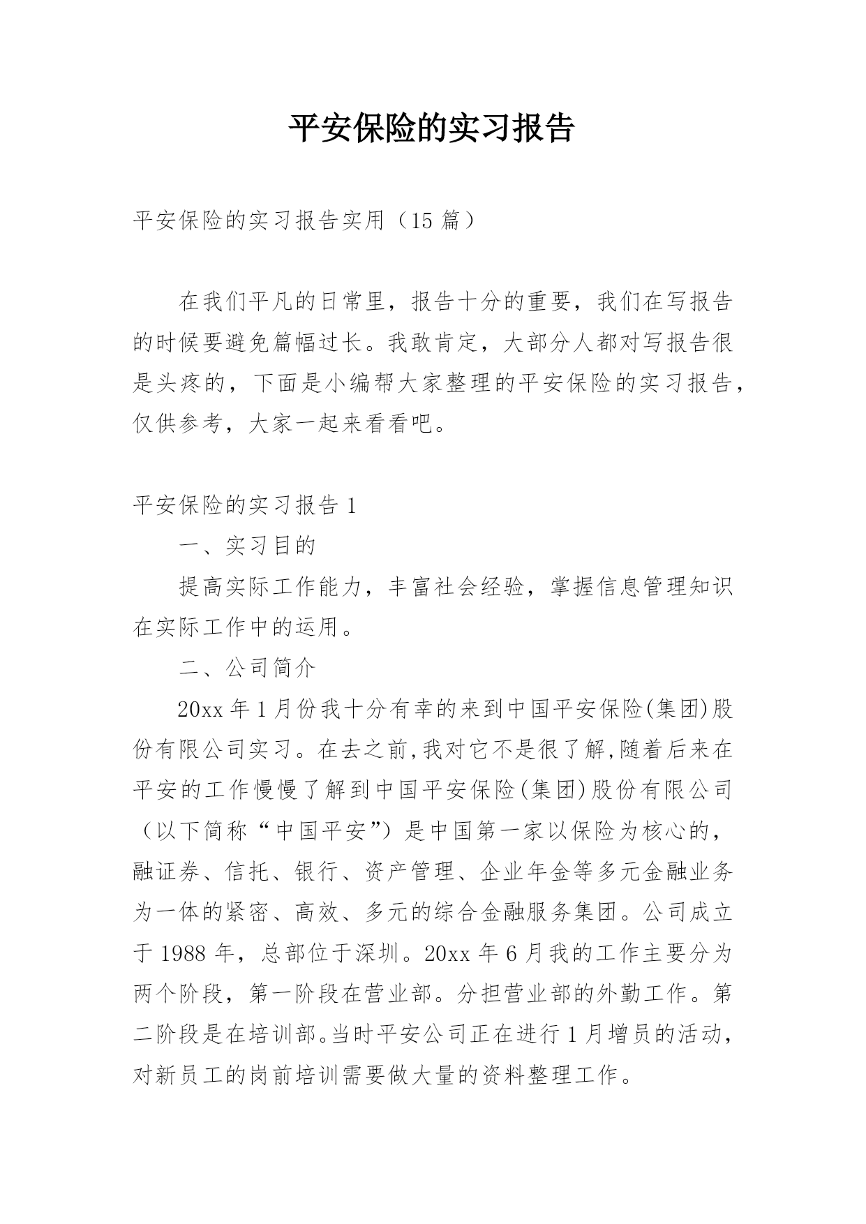 平安保险的实习报告平安保险的实习报告实用(15篇)在我们平凡的日常里,报告十分的重要,我们在写报告的时候要避免篇幅过长。我敢肯定,大部分人都对写报告很是头疼的,下面是小编帮大家整理的平安保险的实习报告,仅供参考,大家一起来看看吧。平安保险的实习报告1一、实习目的提高实际工作能力,丰富社会经验,掌握信息管理知识在实际工作中的运用。二、公司简介20xx年1月份我十分有幸的来到中国平安保险(集团)股份有限公司实习。在去之前,我对它不是很了解,随着后来在平安的工作慢慢了解到中国平安保险(集团)股份有限公司(以下简