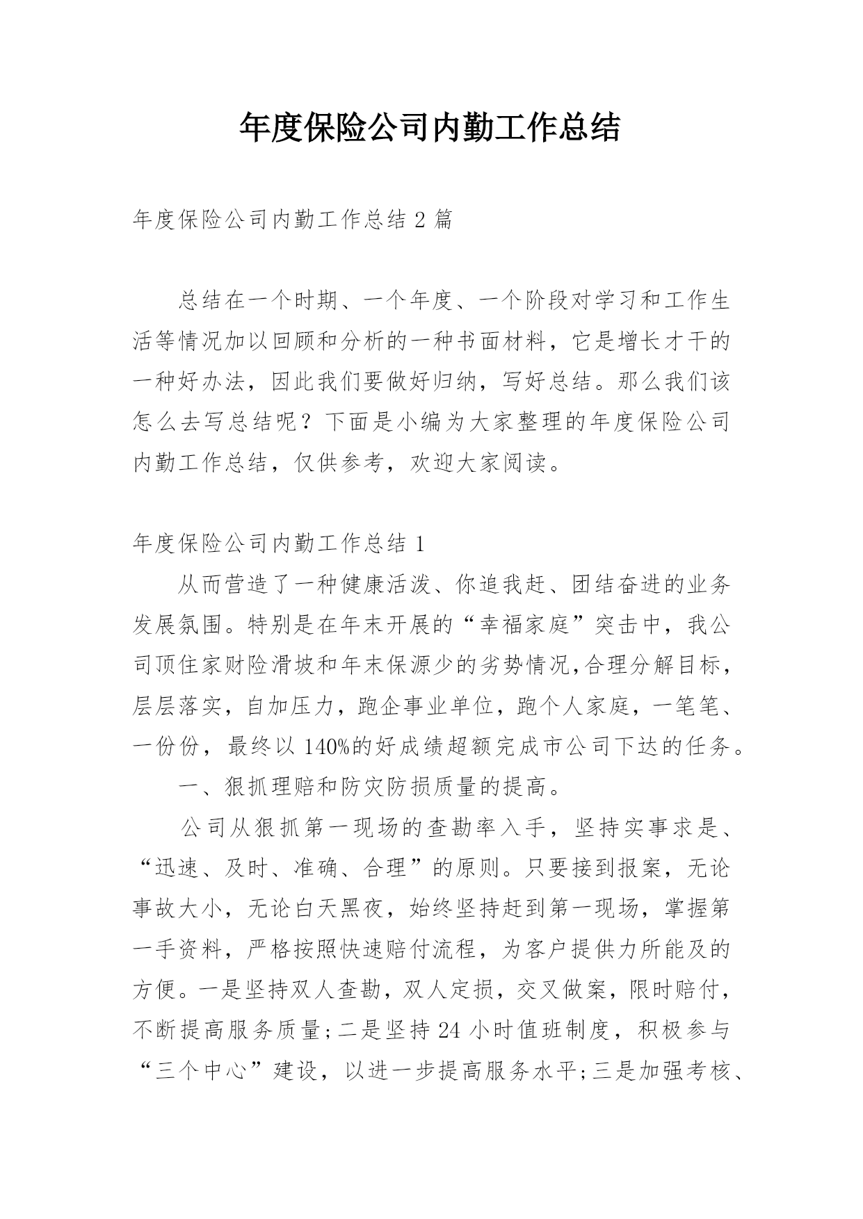 年度保险公司内勤工作总结年度保险公司内勤工作总结2篇总结在一个时期、一个年度、一个阶段对学习和工作生活等情况加以回顾和分析的一种书面材料,它是增长才干的一种好办法,因此我们要做好归纳,写好总结。那么我们该怎么去写总结呢?下面是小编为大家整理的年度保险公司内勤工作总结,仅供参考,欢迎大家阅读。年度保险公司内勤工作总结1从而营造了一种健康活泼、你追我赶、团结奋进的业务发展氛围。特别是在年末开展的“幸福家庭”突击中,我公司顶住家财险滑坡和年末保源少的劣势情况,合理分解目标,层层落实,自加压力,跑企事业单位,跑个