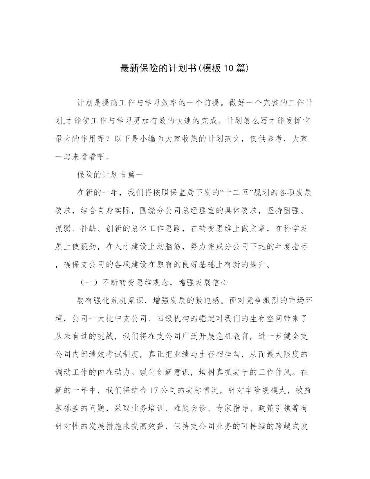 最新保险的计划书(模板10篇)计划是提高工作与学习效率的一个前提。做好一个完整的工作计划,才能使工作与学习更加有效的快速的完成。计划怎么写才能发挥它最大的作用呢?以下是小编为大家收集的计划范文,仅供参考,大家一起来看看吧。保险的计划书篇一在新的一年,我们将按照保监局下发的“十二五”规划的各项发展要求,结合自身实际,围绕分公司总经理室的具体要求,坚持固强、抓弱、补缺、创新的总体工作思路,在转变思维上做文章,在科学发展上使狠劲,在人才建设上动脑筋,努力完成分公司下达的年度指标,确保支公司的各项建设在原有的良好