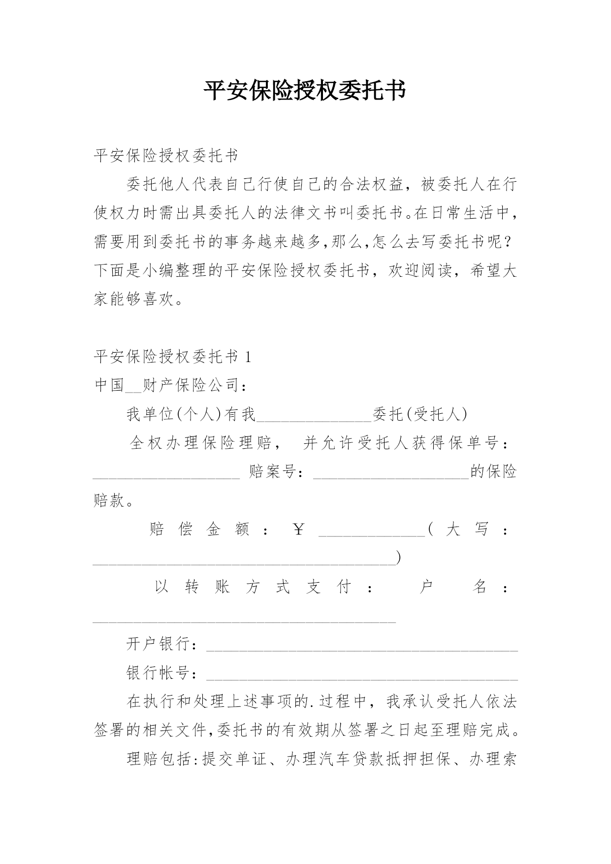 平安保险授权委托书平安保险授权委托书委托他人代表自己行使自己的合法权益,被委托人在行使权力时需出具委托人的法律文书叫委托书。在日常生活中,需要用到委托书的事务越来越多,那么,怎么去写委托书呢?下面是小编整理的平安保险授权委托书,欢迎阅读,希望大家能够喜欢。平安保险授权委托书1中国__财产保险公司:我单位(个人)有我______________委托(受托人)全权办理保险理赔,并允许受托人获得保单号:__________________赔案号:___________________的保险赔款。赔偿金额:¥__