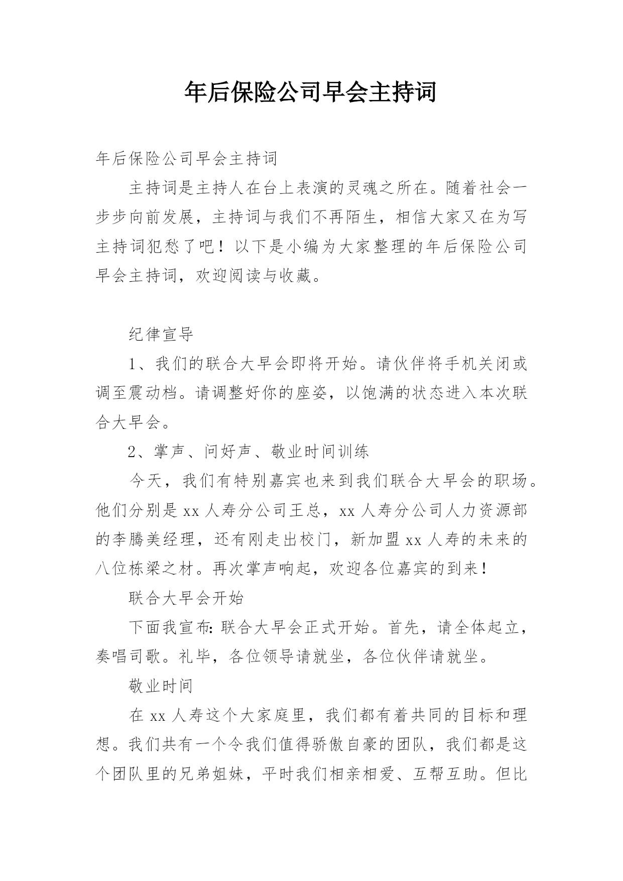 年后保险公司早会主持词年后保险公司早会主持词主持词是主持人在台上表演的灵魂之所在。随着社会一步步向前发展,主持词与我们不再陌生,相信大家又在为写主持词犯愁了吧!以下是小编为大家整理的年后保险公司早会主持词,欢迎阅读与收藏。纪律宣导1、我们的联合大早会即将开始。请伙伴将手机关闭或调至震动档。请调整好你的座姿,以饱满的状态进入本次联合大早会。2、掌声、问好声、敬业时间训练今天,我们有特别嘉宾也来到我们联合大早会的职场。他们分别是xx人寿分公司王总,xx人寿分公司人力资源部的李腾美经理,还有刚走出校门,新加盟x