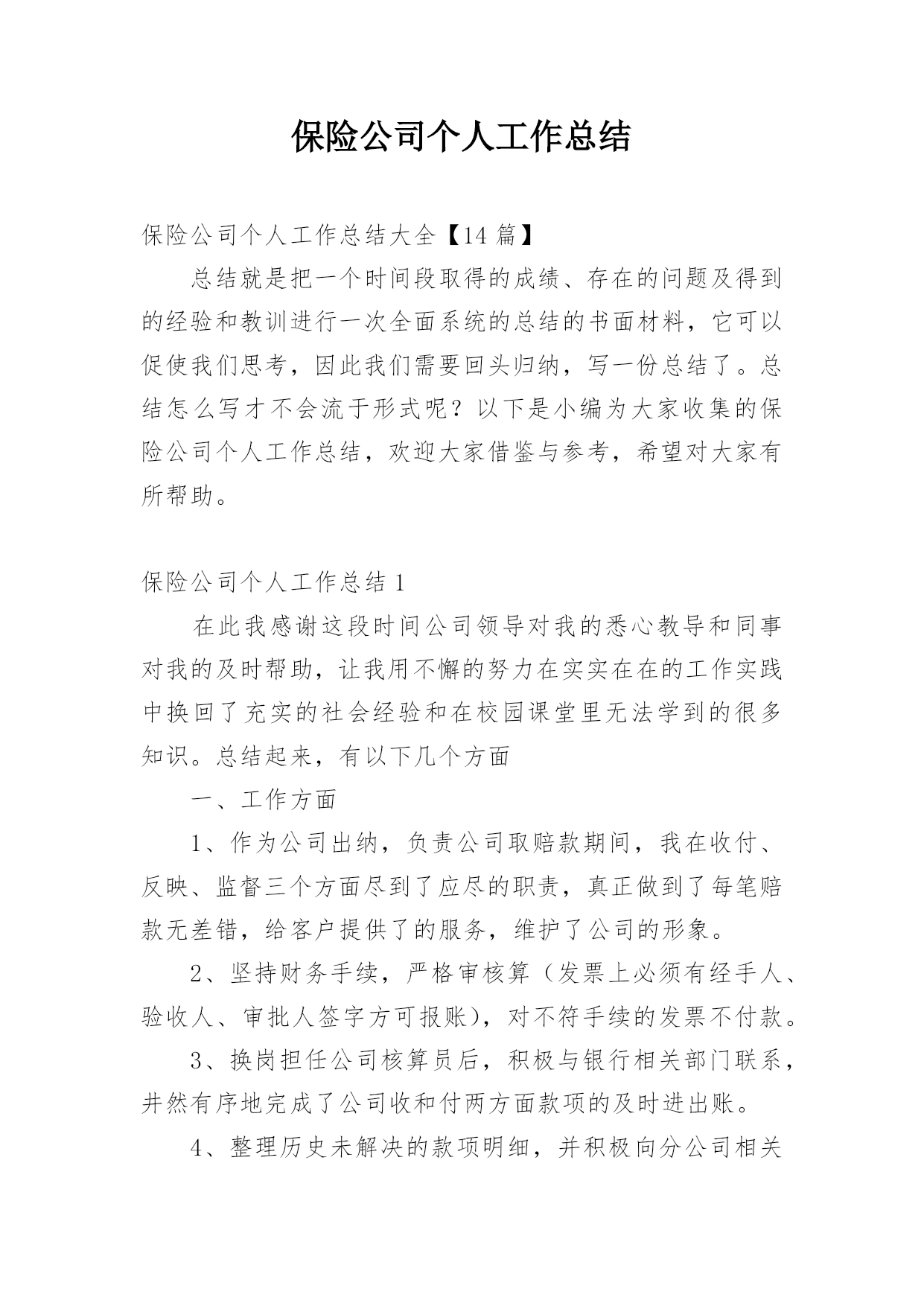 保险公司个人工作总结保险公司个人工作总结大全【14篇】总结就是把一个时间段取得的成绩、存在的问题及得到的经验和教训进行一次全面系统的总结的书面材料,它可以促使我们思考,因此我们需要回头归纳,写一份总结了。总结怎么写才不会流于形式呢?以下是小编为大家收集的保险公司个人工作总结,欢迎大家借鉴与参考,希望对大家有所帮助。保险公司个人工作总结1在此我感谢这段时间公司领导对我的悉心教导和同事对我的及时帮助,让我用不懈的努力在实实在在的工作实践中换回了充实的社会经验和在校园课堂里无法学到的很多知识。总结起来,有以下几