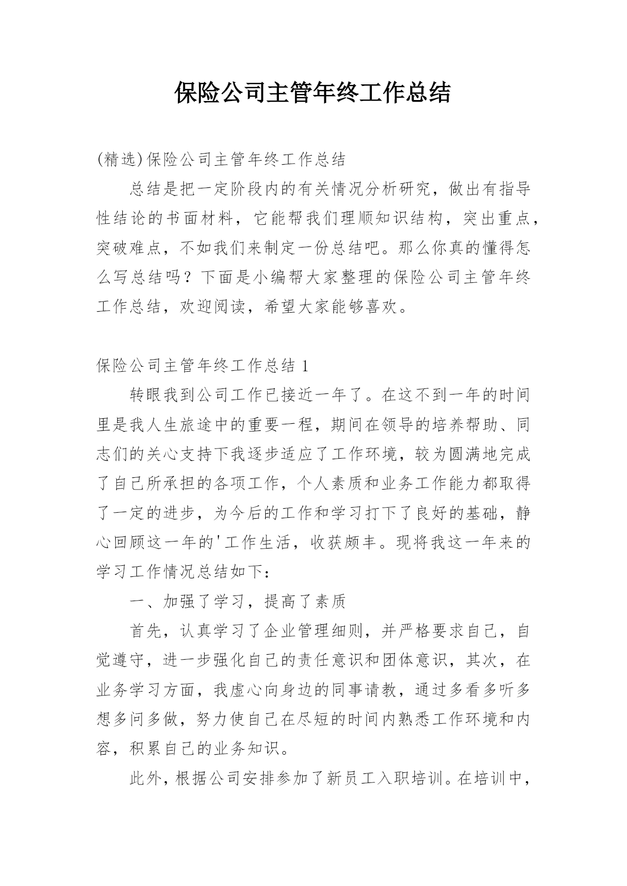 保险公司主管年终工作总结(精选)保险公司主管年终工作总结总结是把一定阶段内的有关情况分析研究,做出有指导性结论的书面材料,它能帮我们理顺知识结构,突出重点,突破难点,不如我们来制定一份总结吧。那么你真的懂得怎么写总结吗?下面是小编帮大家整理的保险公司主管年终工作总结,欢迎阅读,希望大家能够喜欢。保险公司主管年终工作总结1转眼我到公司工作已接近一年了。在这不到一年的时间里是我人生旅途中的重要一程,期间在领导的培养帮助、同志们的关心支持下我逐步适应了工作环境,较为圆满地完成了自己所承担的各项工作,个人素质和业