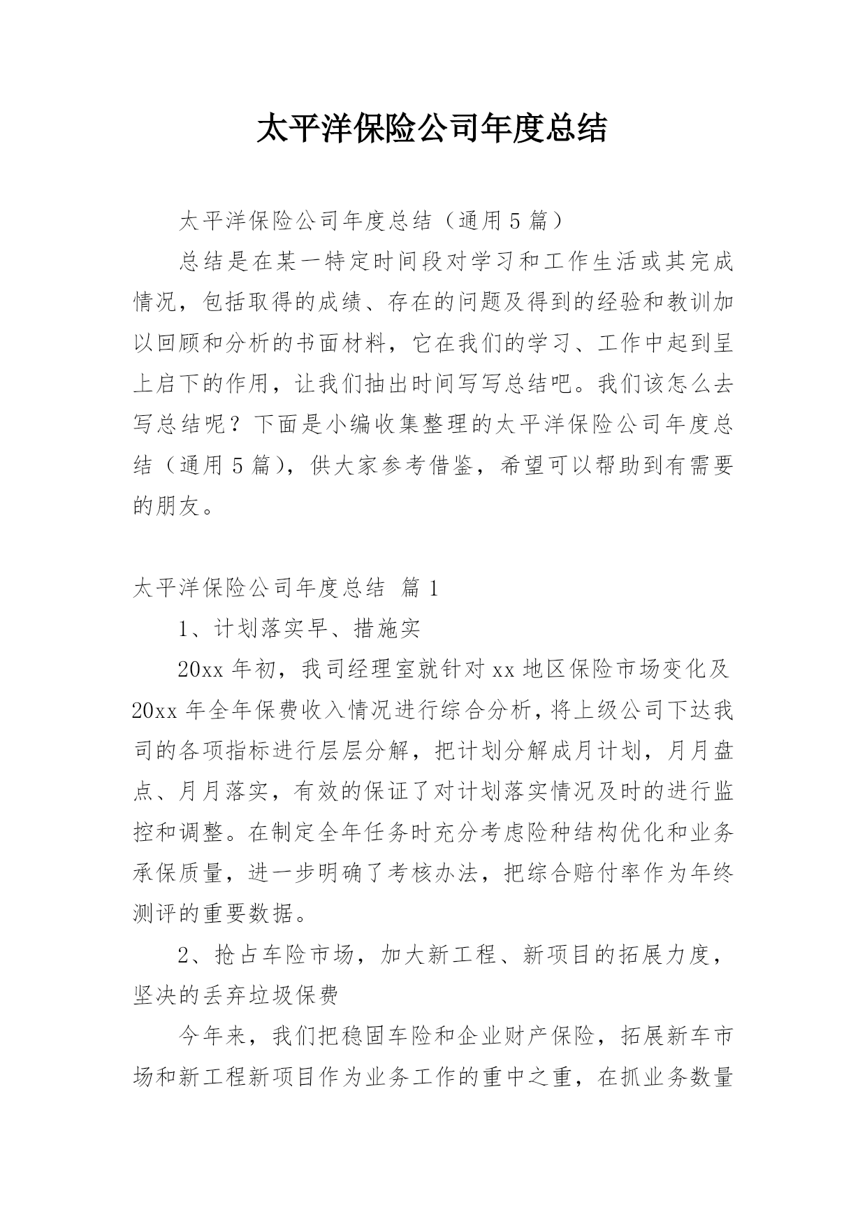 太平洋保险公司年度总结太平洋保险公司年度总结(通用5篇)总结是在某一特定时间段对学习和工作生活或其完成情况,包括取得的成绩、存在的问题及得到的经验和教训加以回顾和分析的书面材料,它在我们的学习、工作中起到呈上启下的作用,让我们抽出时间写写总结吧。我们该怎么去写总结呢?下面是小编收集整理的太平洋保险公司年度总结(通用5篇),供大家参考借鉴,希望可以帮助到有需要的朋友。太平洋保险公司年度总结篇11、计划落实早、措施实20xx年初,我司经理室就针对xx地区保险市场变化及20xx年全年保费收入情况进行综合分析,将