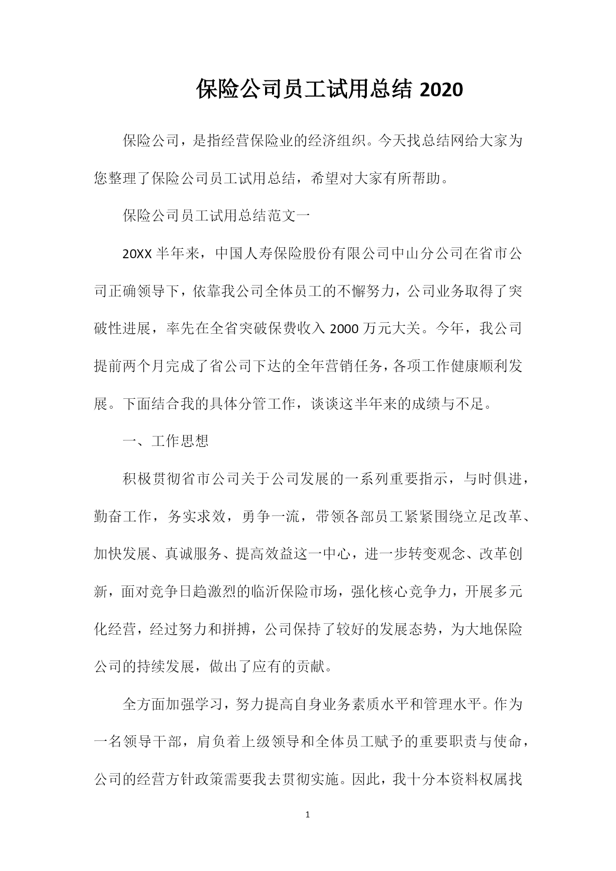 PAGEPAGE13保险公司员工试用总结2020保险公司,是指经营保险业的经济组织。今天找总结网给大家为您整理了保险公司员工试用总结,希望对大家有所帮助。保险公司员工试用总结范文一20XX半年来,中国人寿保险股份有限公司中山分公司在省市公司正确领导下,依靠我公司全体员工的不懈努力,公司业务取得了突破性进展,率先在全省突破保费收入2000万元大关。今年,我公司提前两个月完成了省公司下达的全年营销任务,各项工作健康顺利发展。下面结合我的具体分管工作,谈谈这半年来的成绩与不足。一、工作思想积极贯彻省