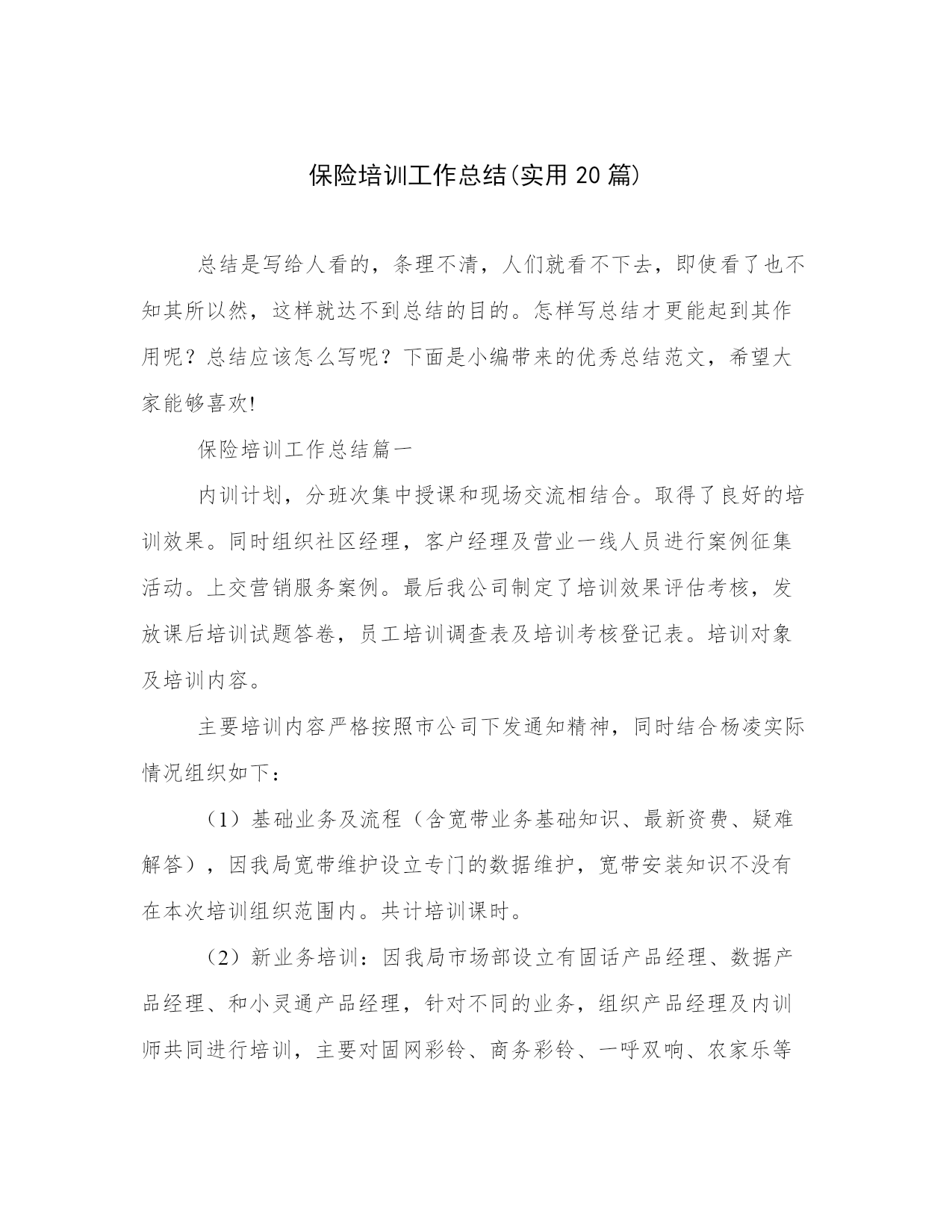 保险培训工作总结(实用20篇)总结是写给人看的,条理不清,人们就看不下去,即使看了也不知其所以然,这样就达不到总结的目的。怎样写总结才更能起到其作用呢?总结应该怎么写呢?下面是小编带来的优秀总结范文,希望大家能够喜欢!保险培训工作总结篇一内训计划,分班次集中授课和现场交流相结合。取得了良好的培训效果。同时组织社区经理,客户经理及营业一线人员进行案例征集活动。上交营销服务案例。最后我公司制定了培训效果评估考核,发放课后培训试题答卷,员工培训调查表及培训考核登记表。培训对象及培训内容。主要培训内容严格按照市公