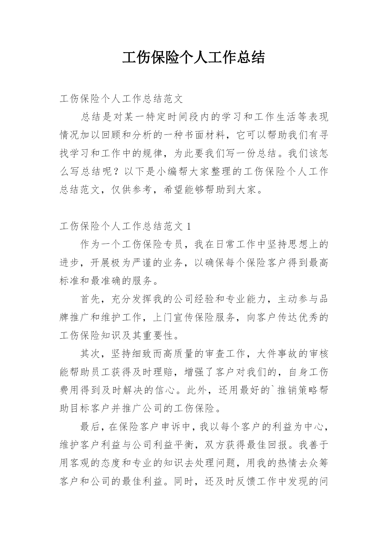 工伤保险个人工作总结工伤保险个人工作总结范文总结是对某一特定时间段内的学习和工作生活等表现情况加以回顾和分析的一种书面材料,它可以帮助我们有寻找学习和工作中的规律,为此要我们写一份总结。我们该怎么写总结呢?以下是小编帮大家整理的工伤保险个人工作总结范文,仅供参考,希望能够帮助到大家。工伤保险个人工作总结范文1作为一个工伤保险专员,我在日常工作中坚持思想上的进步,开展极为严谨的业务,以确保每个保险客户得到最高标准和最准确的服务。首先,充分发挥我的公司经验和专业能力,主动参与品牌推广和维护工作,上门宣传保险服