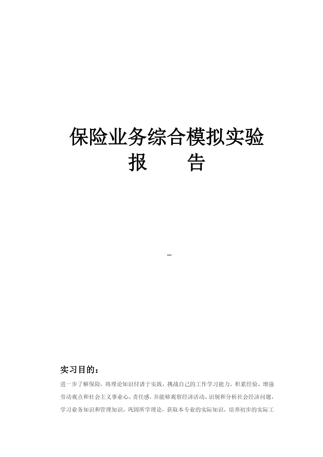 保险业务综合模拟实验报告实习目的:进一步了解保险,将理论知识付诸于实践,挑战自己的工作学习能力,积累经验。增强劳动观点和社会主义事业心、责任感,并能够观察经济活动、识别和分析社会经济问题,学习业务知识和管理知识,巩固所学理论,获取本专业的实际知识,培养初步的实际工作能力和专业技能。具体要求包括:1、了解并熟悉保险过程中的各个角色作用及工作流程。2、理论联系实际,学会运用所学的基础理论、基本知识和基本技能去解决经纪中介实践中的具体问题。3、预演和准备就业。在以后的学习期间及时补充相关知识,为求职与正式工作做