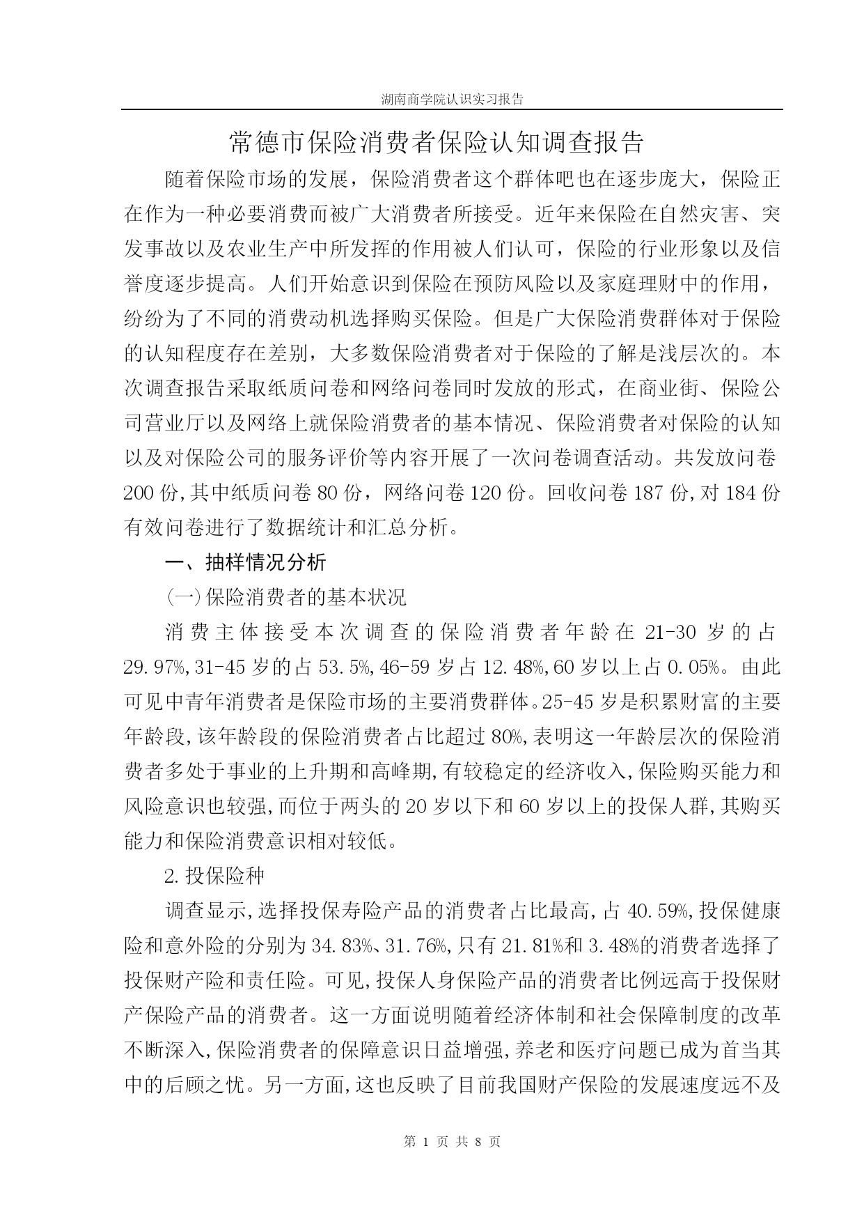 湖南商学院认识实习报告第PAGE8页共NUMPAGES8页常德市保险消费者保险认知调查报告随着保险市场的发展,保险消费者这个群体吧也在逐步庞大,保险正在作为一种必要消费而被广大消费者所接受。近年来保险在自然灾害、突发事故以及农业生产中所发挥的作用被人们认可,保险的行业形象以及信誉度逐步提高。人们开始意识到保险在预防风险以及家庭理财中的作用,纷纷为了不同的消费动机选择购买保险。但是广大保险消费群体对于保险的认知程度存在差别,大多数保险消费者对于保险的了解是浅层次的。本次调查报告采取纸质问卷和网络