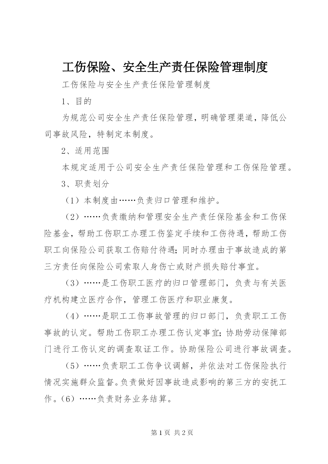 第PAGE\*Arabic\*MERGEFORMAT2页共NUMPAGES\*MERGEFORMAT2页工伤保险、安全生产责任保险管理制度工伤保险与安全生产责任保险管理制度1、目的为规范公司安全生产责任保险管理,明确管理渠道,降低公司事故风险,特制定本制度。2、适用范围本规定适用于公司安全生产责任保险管理和工伤保险管理。3、职责划分(1)本制度由……负责归口管理和维护。(2)……负责缴纳和管理安全生产责任保险基金和工伤保险基金,帮助工伤职工办理工伤鉴定手续和工伤待遇,帮助工伤职工向保险公司获取