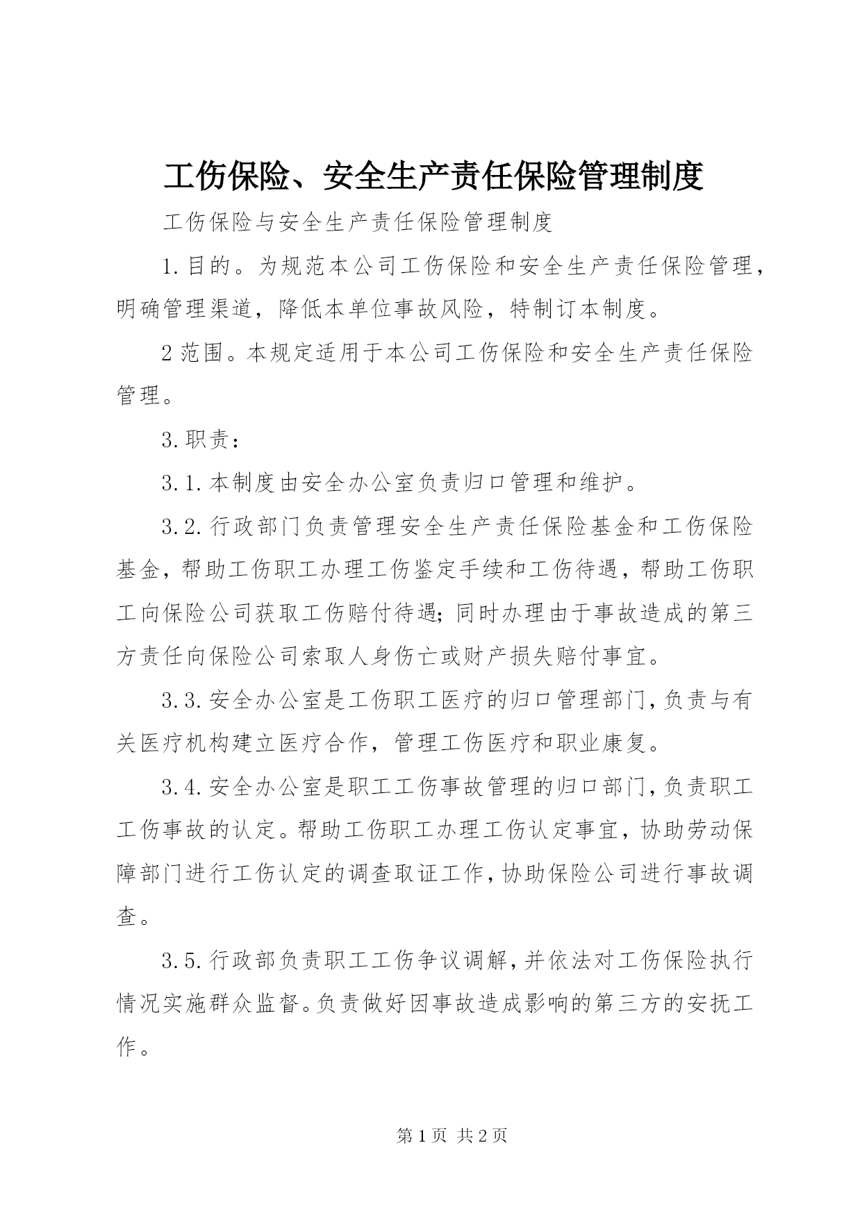 第PAGE\*Arabic\*MERGEFORMAT2页共NUMPAGES\*MERGEFORMAT2页工伤保险、安全生产责任保险管理制度工伤保险与安全生产责任保险管理制度1.目的。为规范本公司工伤保险和安全生产责任保险管理,明确管理渠道,降低本单位事故风险,特制订本制度。2范围。本规定适用于本公司工伤保险和安全生产责任保险管理。3.职责:3.1.本制度由安全办公室负责归口管理和维护。3.2.行政部门负责管理安全生产责任保险基金和工伤保险基金,帮助工伤职工办理工伤鉴定手续和工伤待遇,帮助工伤职