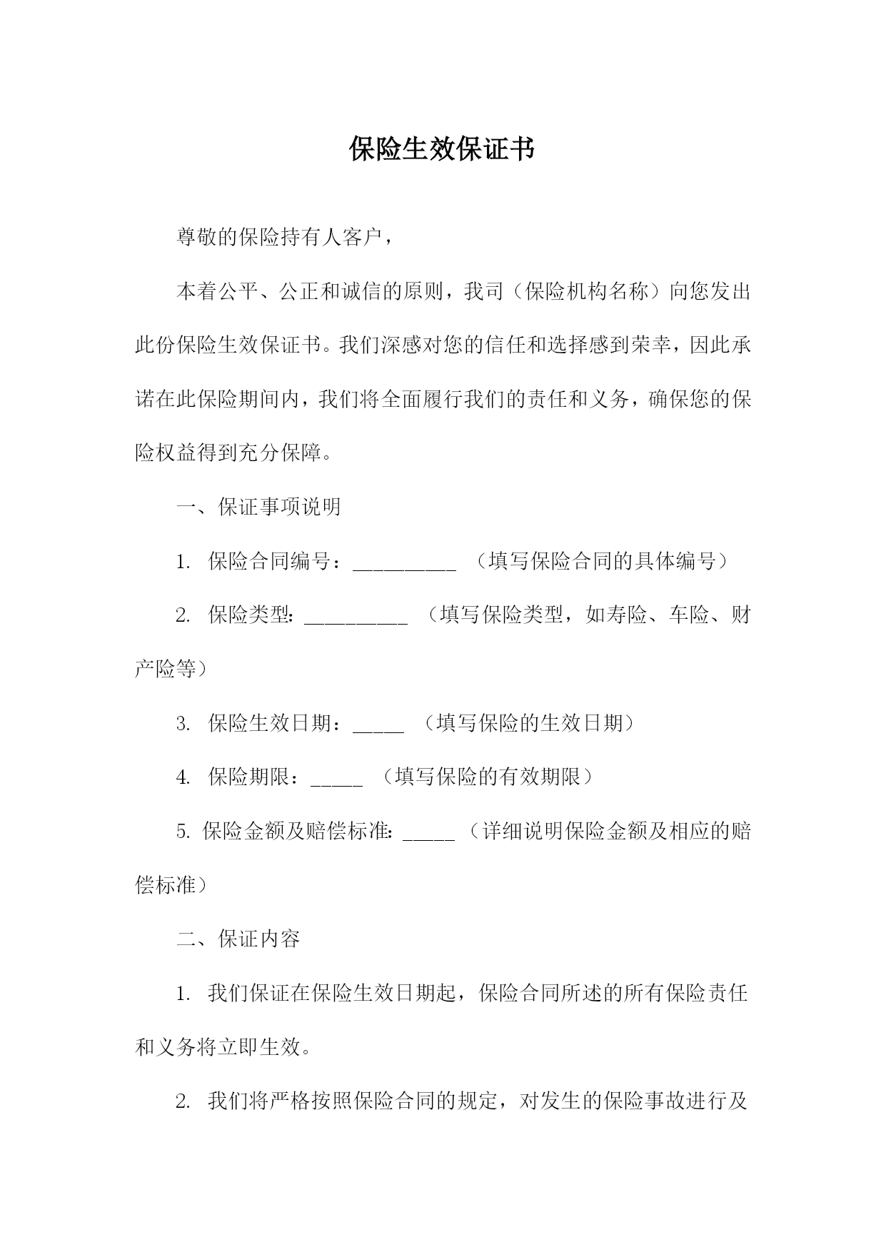 保险生效保证书尊敬的保险持有人客户,本着公平、公正和诚信的原则,我司(保险机构名称)向您发出此份保险生效保证书。我们深感对您的信任和选择感到荣幸,因此承诺在此保险期间内,我们将全面履行我们的责任和义务,确保您的保险权益得到充分保障。一、保证事项说明1.保险合同编号:__________(填写保险合同的具体编号)2.保险类型:__________(填写保险类型,如寿险、车险、财产险等)3.保险生效日期:_____(填写保险的生效日期)4.保险期限:_____(填写保险的有效期限)5.保险金额及赔偿标准:__