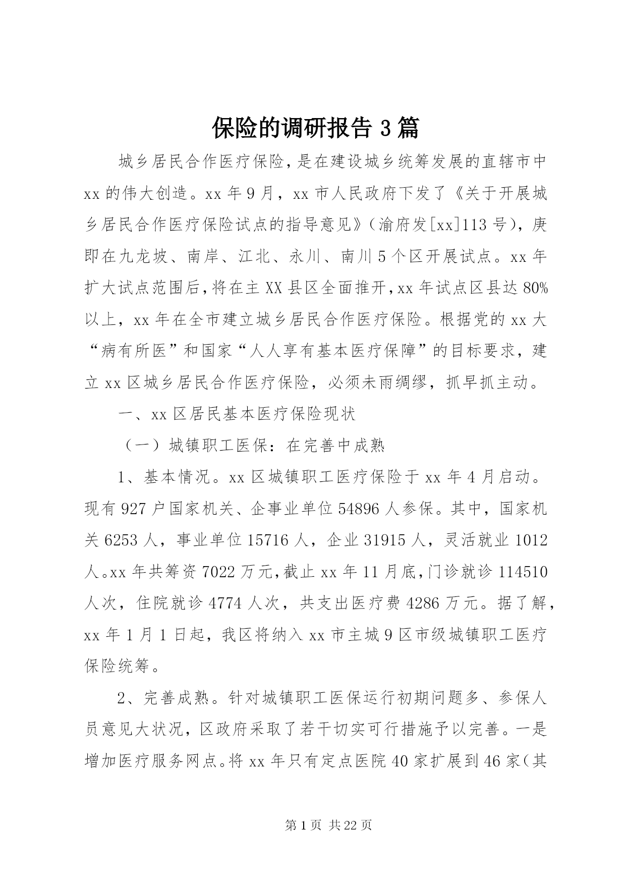 第PAGE\*Arabic\*MERGEFORMAT22页共NUMPAGES\*MERGEFORMAT22页保险的调研报告3篇城乡居民合作医疗保险,是在建设城乡统筹发展的直辖市中xx的伟大创造。xx年9月,xx市人民政府下发了《关于开展城乡居民合作医疗保险试点的指导意见》(渝府发[xx]113号),庚即在九龙坡、南岸、江北、永川、南川5个区开展试点。xx年扩大试点范围后,将在主XX县区全面推开,xx年试点区县达80%以上,xx年在全市建立城乡居民合作医疗保险。根据党的xx大“病有所医”和国家“