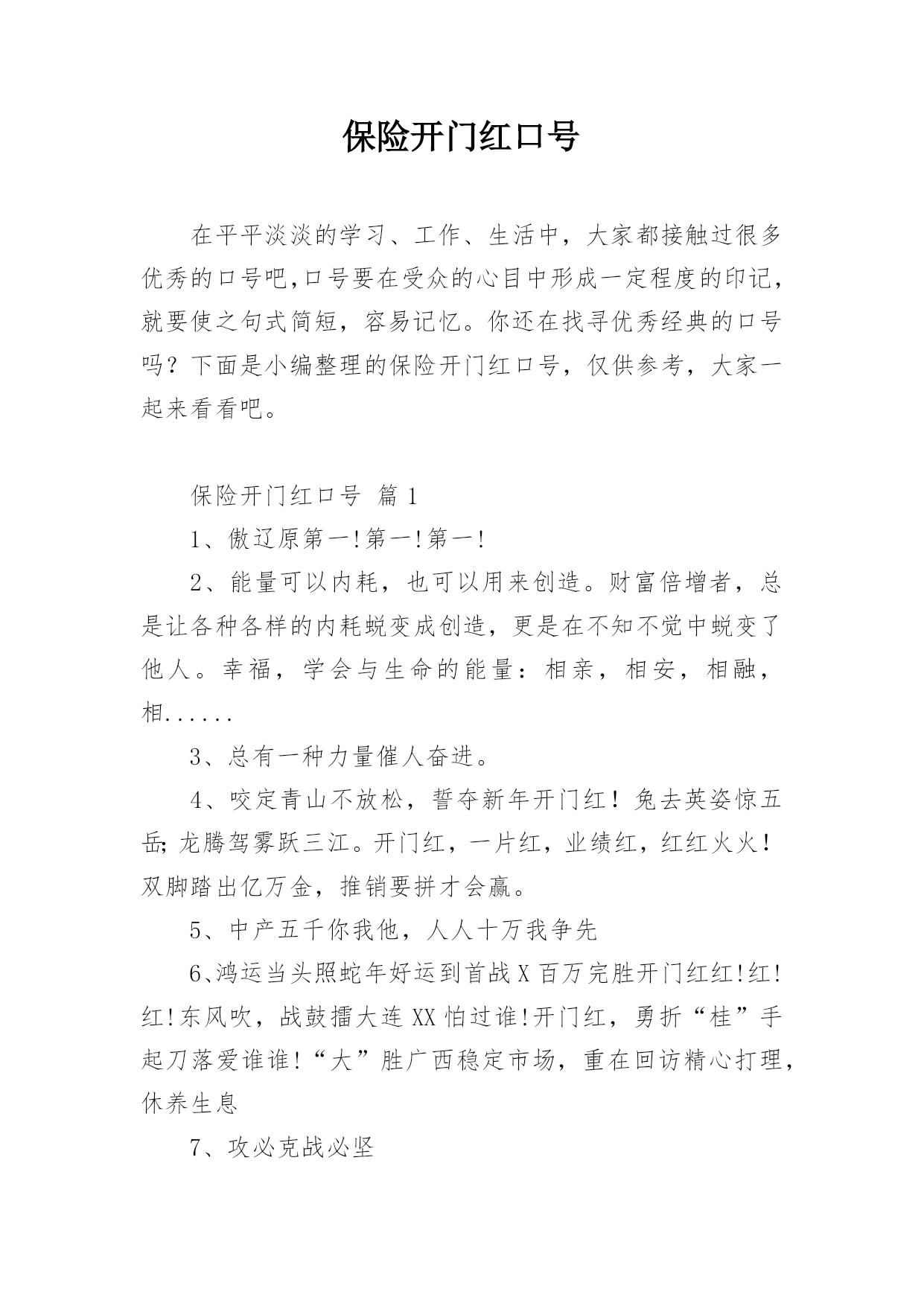 保险开门红口号在平平淡淡的学习、工作、生活中,大家都接触过很多优秀的口号吧,口号要在受众的心目中形成一定程度的印记,就要使之句式简短,容易记忆。你还在找寻优秀经典的口号吗?下面是小编整理的保险开门红口号,仅供参考,大家一起来看看吧。保险开门红口号篇11、傲辽原第一!第一!第一!2、能量可以内耗,也可以用来创造。财富倍增者,总是让各种各样的内耗蜕变成创造,更是在不知不觉中蜕变了他人。幸福,学会与生命的能量:相亲,相安,相融,相......3、总有一种力量催人奋进。4、咬定青山不放松,誓夺新年开门红!兔去英姿