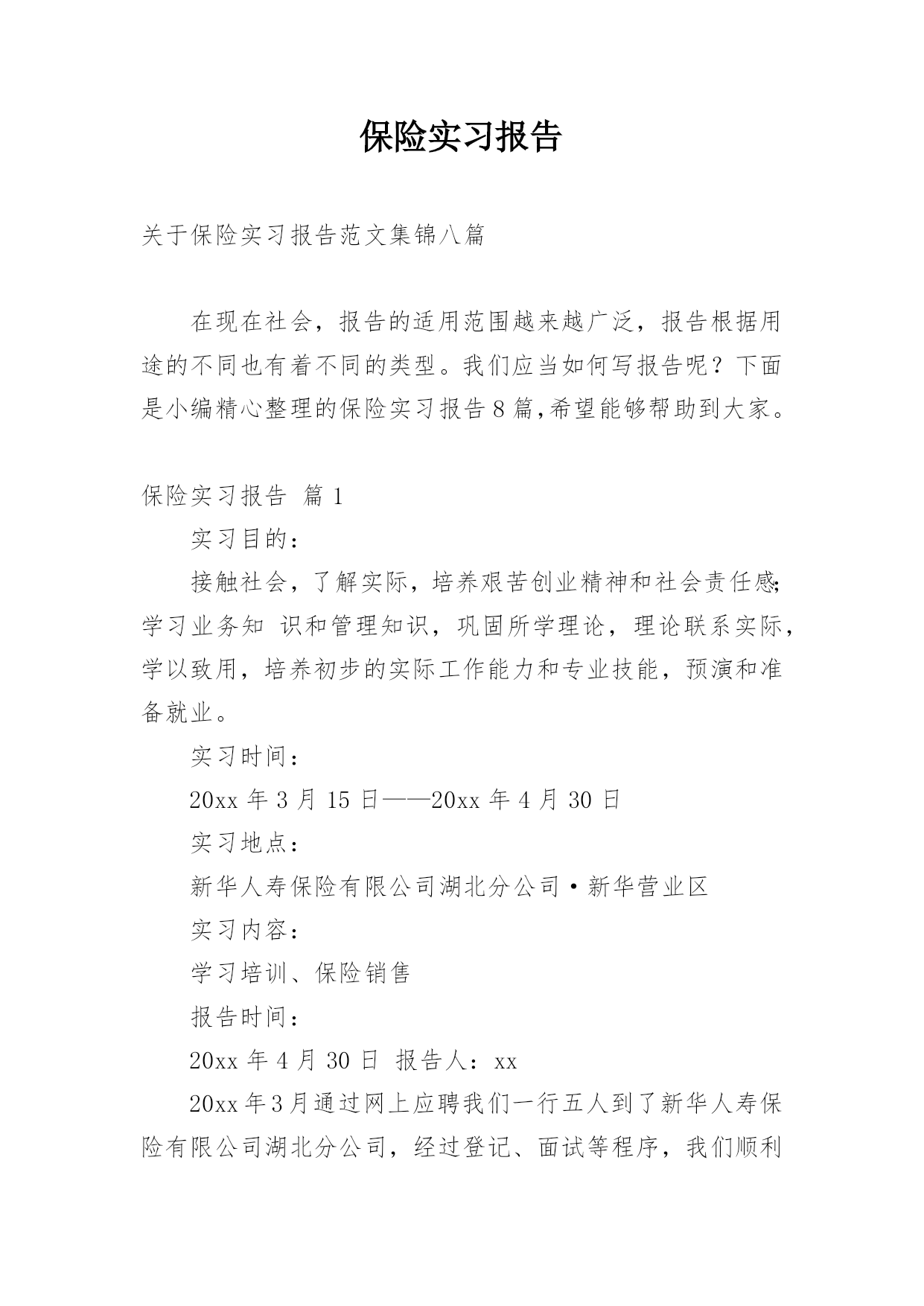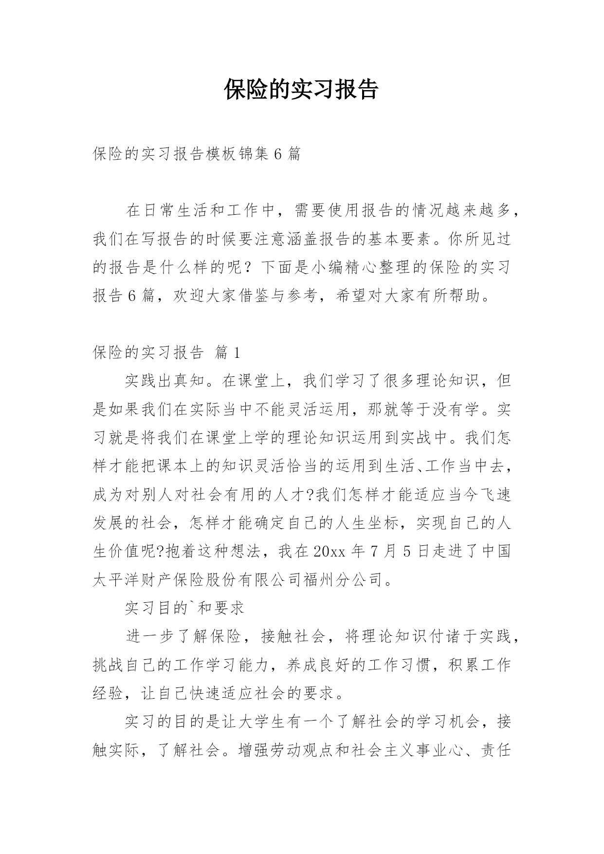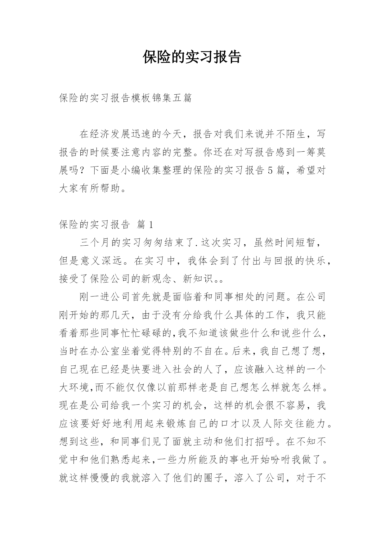 保险的实习报告保险的实习报告模板锦集五篇在经济发展迅速的今天,报告对我们来说并不陌生,写报告的时候要注意内容的完整。你还在对写报告感到一筹莫展吗?下面是小编收集整理的保险的实习报告5篇,希望对大家有所帮助。保险的实习报告篇1三个月的实习匆匆结束了.这次实习,虽然时间短暂,但是意义深远。在实习中,我体会到了付出与回报的快乐,接受了保险公司的新观念、新知识。。刚一进公司首先就是面临着和同事相处的问题。在公司刚开始的那几天,由于没有分给我什么具体的工作,我只能看着那些同事忙忙碌碌的,我不知道该做些什么和说些什么