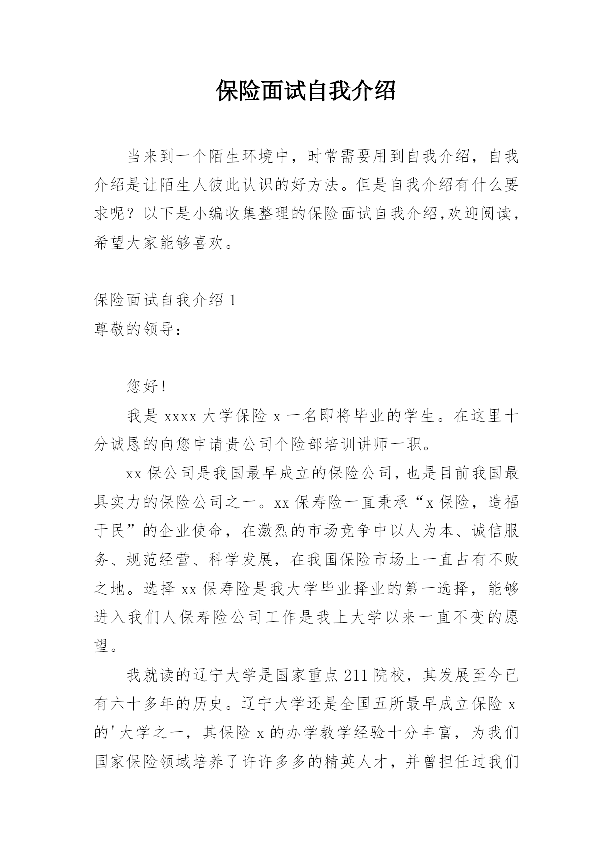 保险面试自我介绍当来到一个陌生环境中,时常需要用到自我介绍,自我介绍是让陌生人彼此认识的好方法。但是自我介绍有什么要求呢?以下是小编收集整理的保险面试自我介绍,欢迎阅读,希望大家能够喜欢。保险面试自我介绍1尊敬的领导:您好!我是xxxx大学保险x一名即将毕业的学生。在这里十分诚恳的向您申请贵公司个险部培训讲师一职。xx保公司是我国最早成立的保险公司,也是目前我国最具实力的保险公司之一。xx保寿险一直秉承“x保险,造福于民”的企业使命,在激烈的市场竞争中以人为本、诚信服务、规范经营、科学发展,在我国保险市场