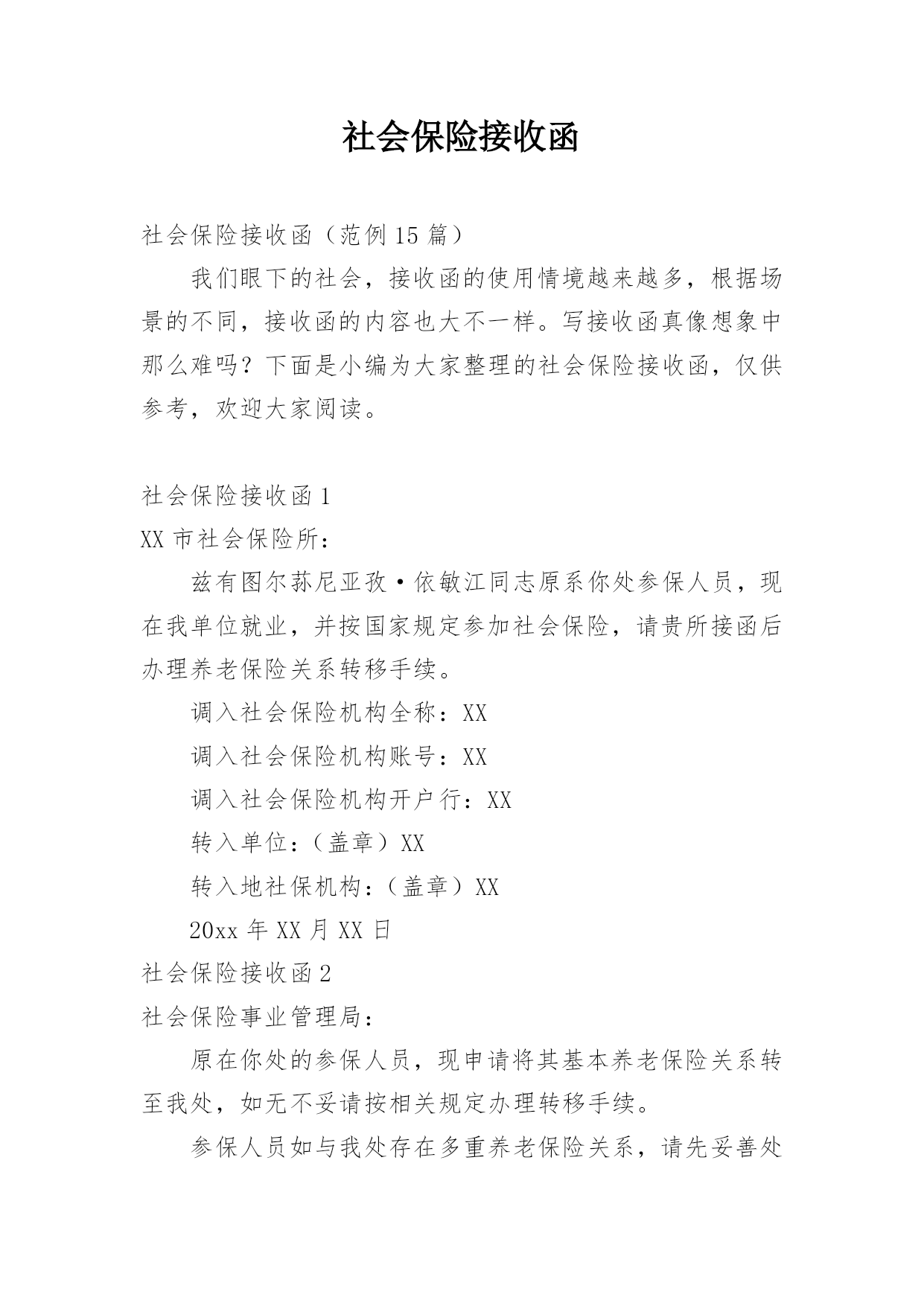 社会保险接收函社会保险接收函(范例15篇)我们眼下的社会,接收函的使用情境越来越多,根据场景的不同,接收函的内容也大不一样。写接收函真像想象中那么难吗?下面是小编为大家整理的社会保险接收函,仅供参考,欢迎大家阅读。社会保险接收函1XX市社会保险所:兹有图尔荪尼亚孜·依敏江同志原系你处参保人员,现在我单位就业,并按国家规定参加社会保险,请贵所接函后办理养老保险关系转移手续。调入社会保险机构全称:XX调入社会保险机构账号:XX调入社会保险机构开户行:XX转入单位:(盖章)XX转入地社保机构:(盖章)XX20x