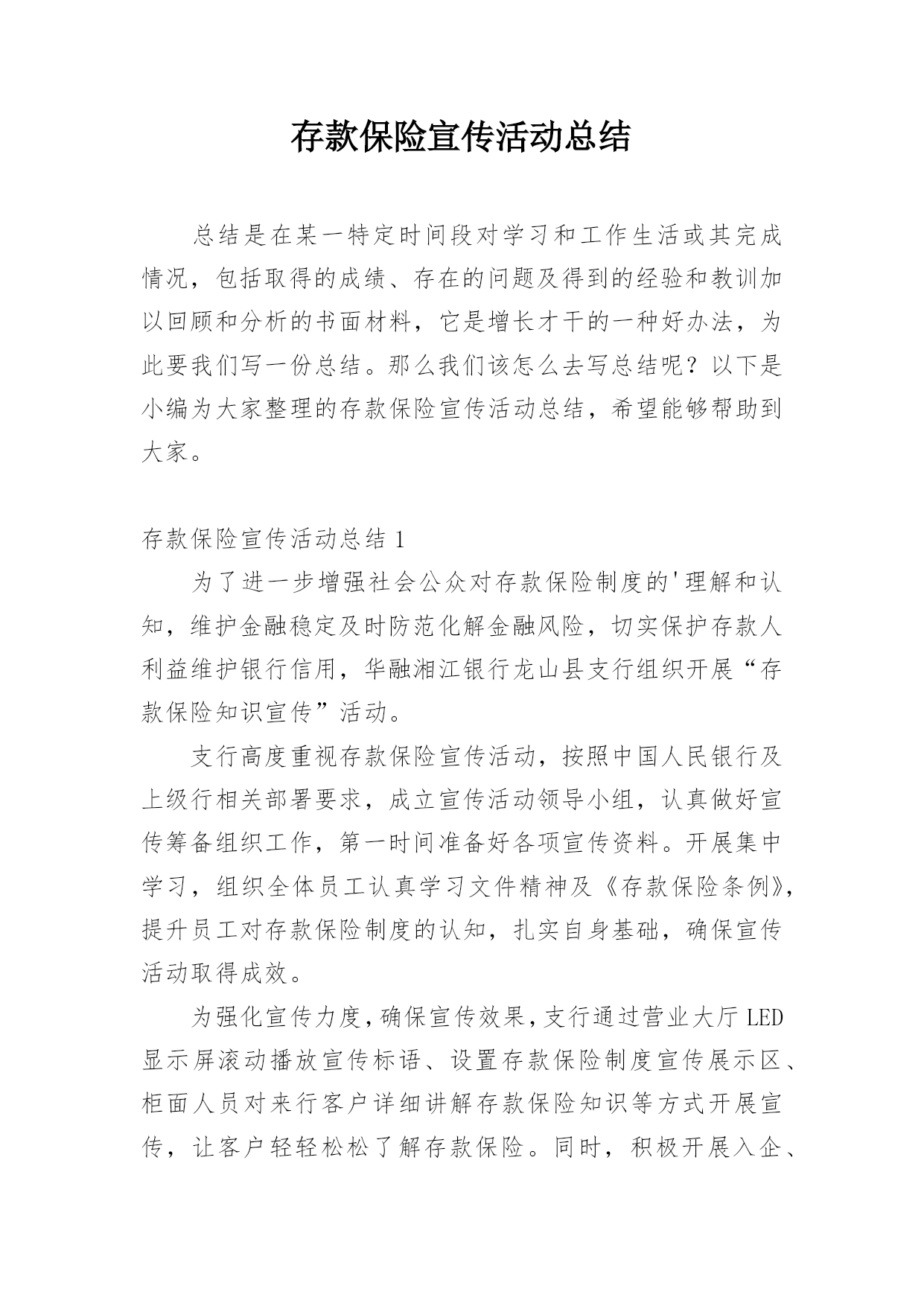 存款保险宣传活动总结总结是在某一特定时间段对学习和工作生活或其完成情况,包括取得的成绩、存在的问题及得到的经验和教训加以回顾和分析的书面材料,它是增长才干的一种好办法,为此要我们写一份总结。那么我们该怎么去写总结呢?以下是小编为大家整理的存款保险宣传活动总结,希望能够帮助到大家。存款保险宣传活动总结1为了进一步增强社会公众对存款保险制度的'理解和认知,维护金融稳定及时防范化解金融风险,切实保护存款人利益维护银行信用,华融湘江银行龙山县支行组织开展“存款保险知识宣传”活动。支行高度重视存款保险宣传活动,按照