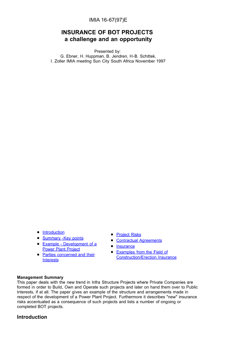 IMIA16-67(97)EINSURANCEOFBOTPROJECTSachallengeandanopportunityPresentedby:G.Ebner,H.Huppman,B.Jendren,H-B.Schittek,I.ZollerIMIAmeetingSunCitySouthAfricaNovember1997IntroductionProjectRisksSummary-KeypointsContractualAgreementsExample-DevelopmentofaInsuran