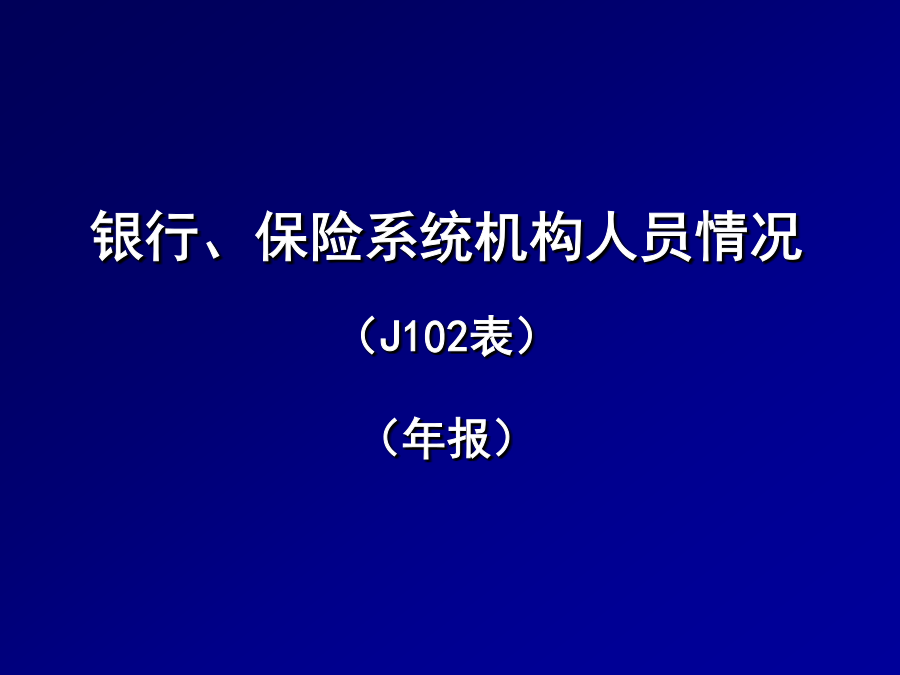 银行、保险系统机构人员情况(J102表)(年报)一、统计对象二、统计内容三、报表表式见《金融业统计报表制度》(统计机构用)P28(J102)指标解释:P97四、指标解释四、指标解释五、指标间关系六、填报注意事项六、填报注意事项六、填报注意事项六、填报注意事项六、填报注意事项六、填报注意事项七、审核需关注问题七、审核需关注问题七、审核需关注问题