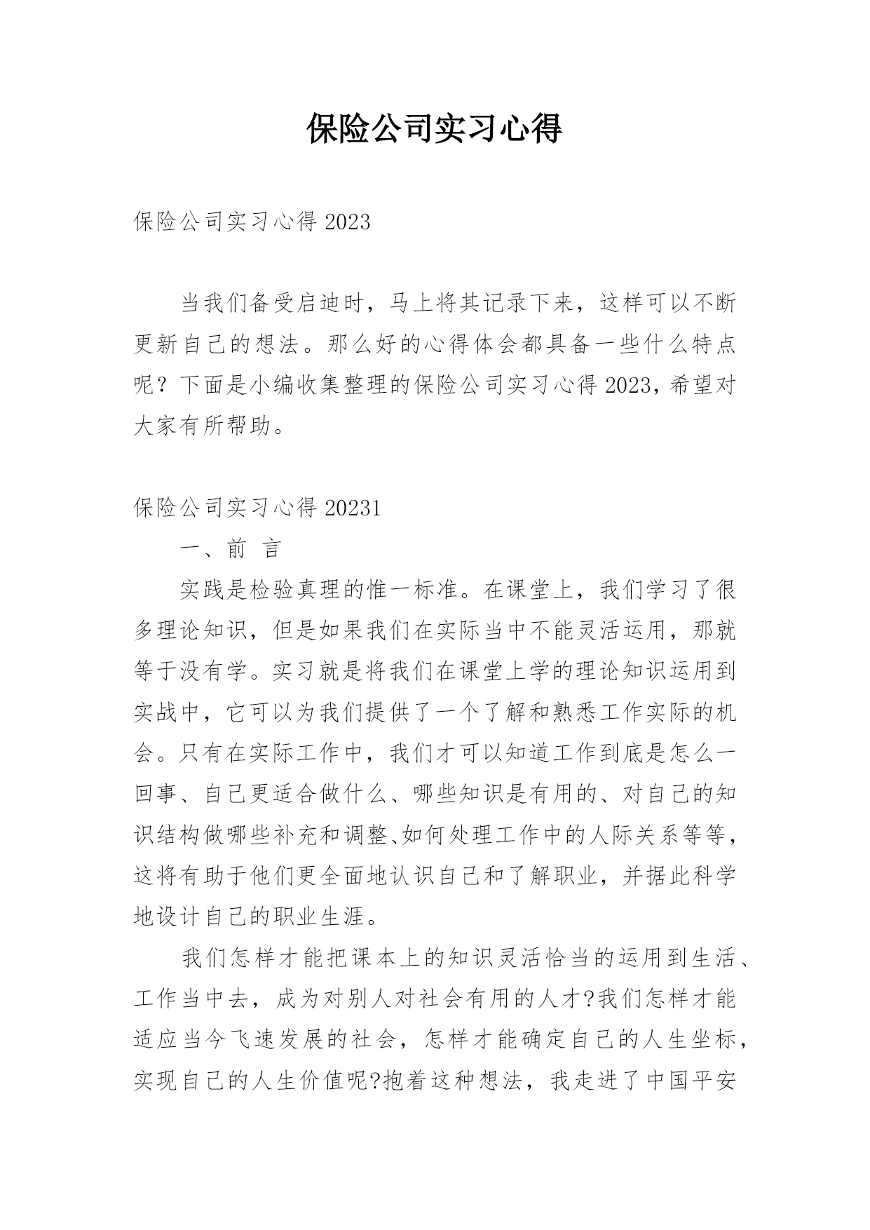 保险公司实习心得保险公司实习心得2023当我们备受启迪时,马上将其记录下来,这样可以不断更新自己的想法。那么好的心得体会都具备一些什么特点呢?下面是小编收集整理的保险公司实习心得2023,希望对大家有所帮助。保险公司实习心得20231一、前言实践是检验真理的惟一标准。在课堂上,我们学习了很多理论知识,但是如果我们在实际当中不能灵活运用,那就等于没有学。实习就是将我们在课堂上学的理论知识运用到实战中,它可以为我们提供了一个了解和熟悉工作实际的机会。只有在实际工作中,我们才可以知道工作到底是怎么一回事、自己更
