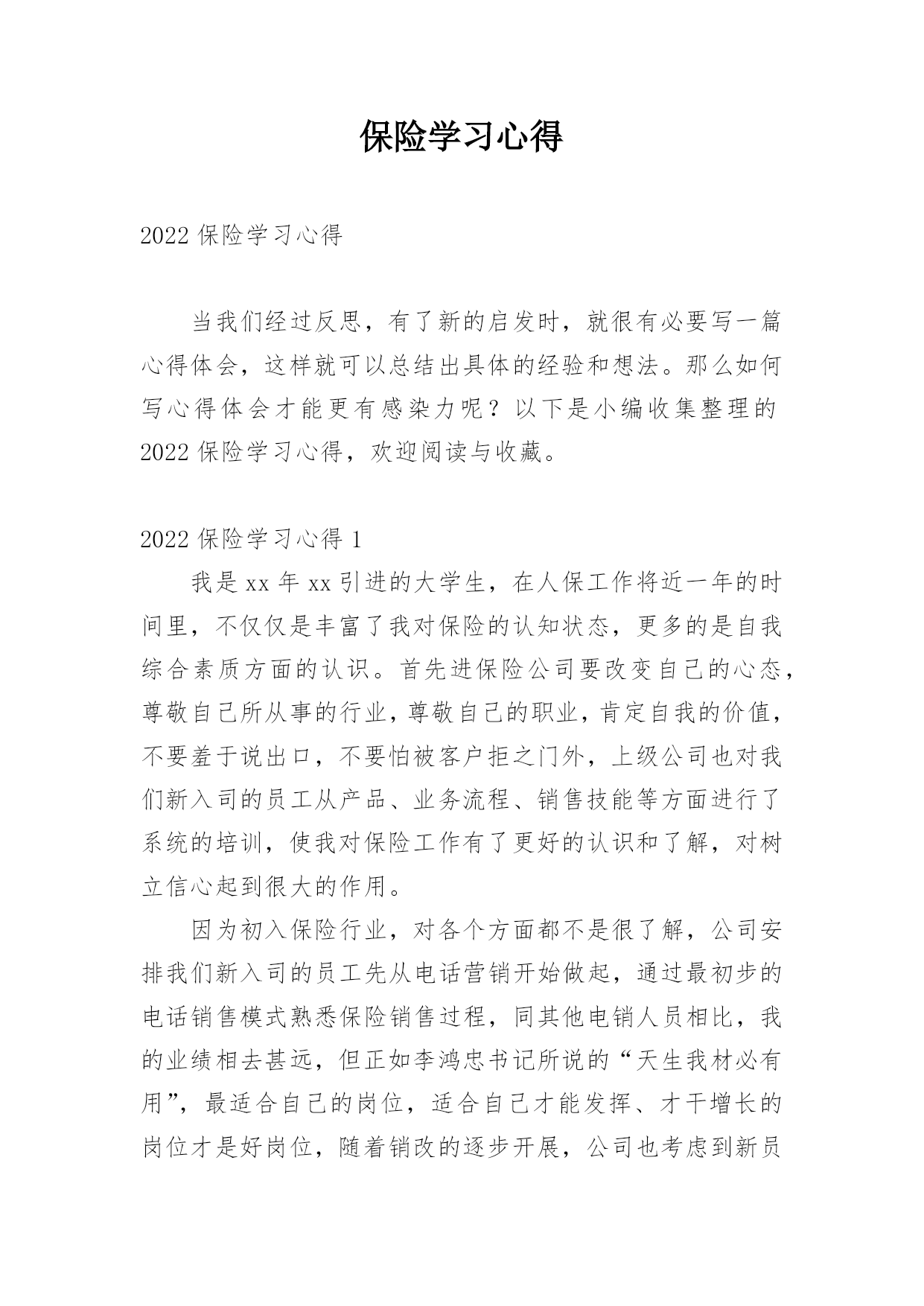 保险学习心得2022保险学习心得当我们经过反思,有了新的启发时,就很有必要写一篇心得体会,这样就可以总结出具体的经验和想法。那么如何写心得体会才能更有感染力呢?以下是小编收集整理的2022保险学习心得,欢迎阅读与收藏。2022保险学习心得1我是xx年xx引进的大学生,在人保工作将近一年的时间里,不仅仅是丰富了我对保险的认知状态,更多的是自我综合素质方面的认识。首先进保险公司要改变自己的心态,尊敬自己所从事的行业,尊敬自己的职业,肯定自我的价值,不要羞于说出口,不要怕被客户拒之门外,上级公司也对我们新入司的