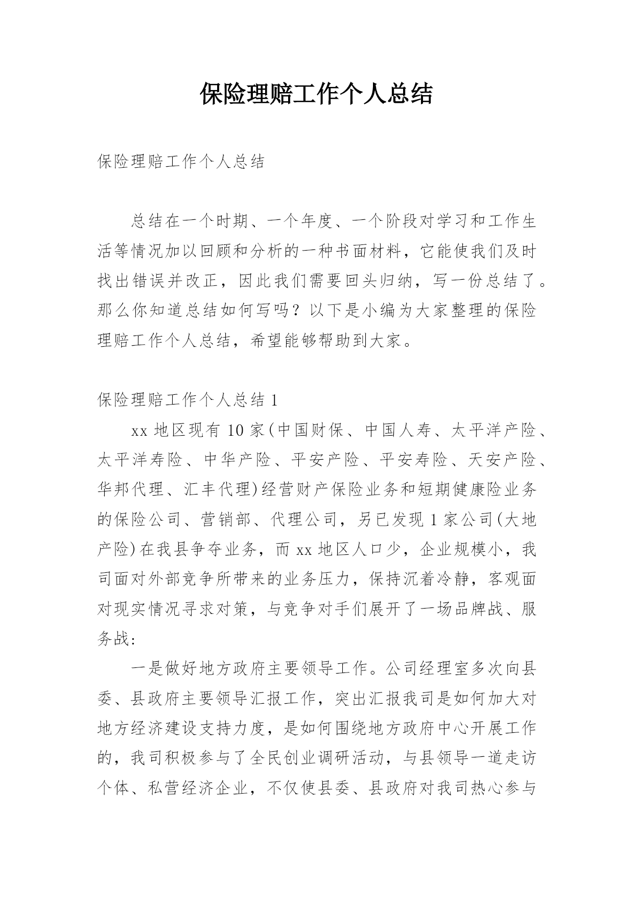 保险理赔工作个人总结保险理赔工作个人总结总结在一个时期、一个年度、一个阶段对学习和工作生活等情况加以回顾和分析的一种书面材料,它能使我们及时找出错误并改正,因此我们需要回头归纳,写一份总结了。那么你知道总结如何写吗?以下是小编为大家整理的保险理赔工作个人总结,希望能够帮助到大家。保险理赔工作个人总结1xx地区现有10家(中国财保、中国人寿、太平洋产险、太平洋寿险、中华产险、平安产险、平安寿险、天安产险、华邦代理、汇丰代理)经营财产保险业务和短期健康险业务的保险公司、营销部、代理公司,另已发现1家公司(大地