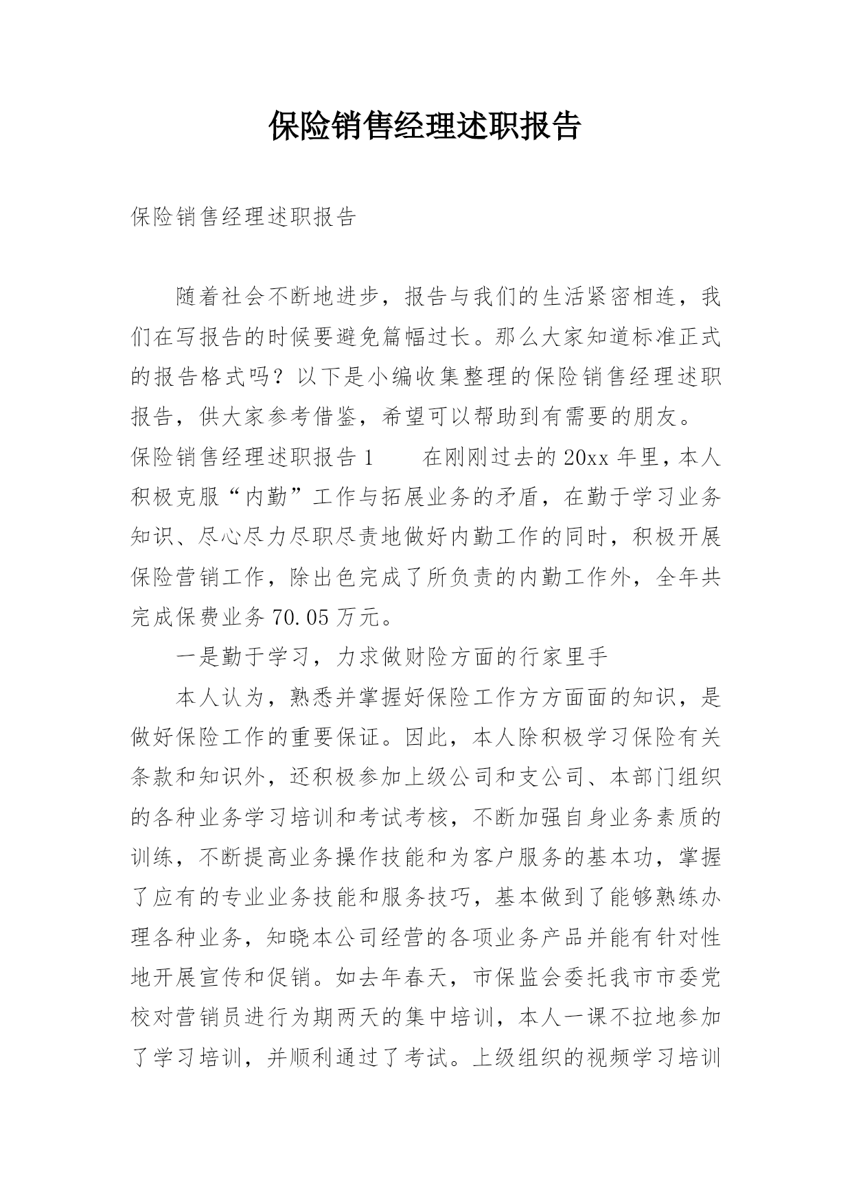 保险销售经理述职报告保险销售经理述职报告随着社会不断地进步,报告与我们的生活紧密相连,我们在写报告的时候要避免篇幅过长。那么大家知道标准正式的报告格式吗?以下是小编收集整理的保险销售经理述职报告,供大家参考借鉴,希望可以帮助到有需要的朋友。保险销售经理述职报告1在刚刚过去的20xx年里,本人积极克服“内勤”工作与拓展业务的矛盾,在勤于学习业务知识、尽心尽力尽职尽责地做好内勤工作的同时,积极开展保险营销工作,除出色完成了所负责的内勤工作外,全年共完成保费业务70.05万元。一是勤于学习,力求做财险方面的行家