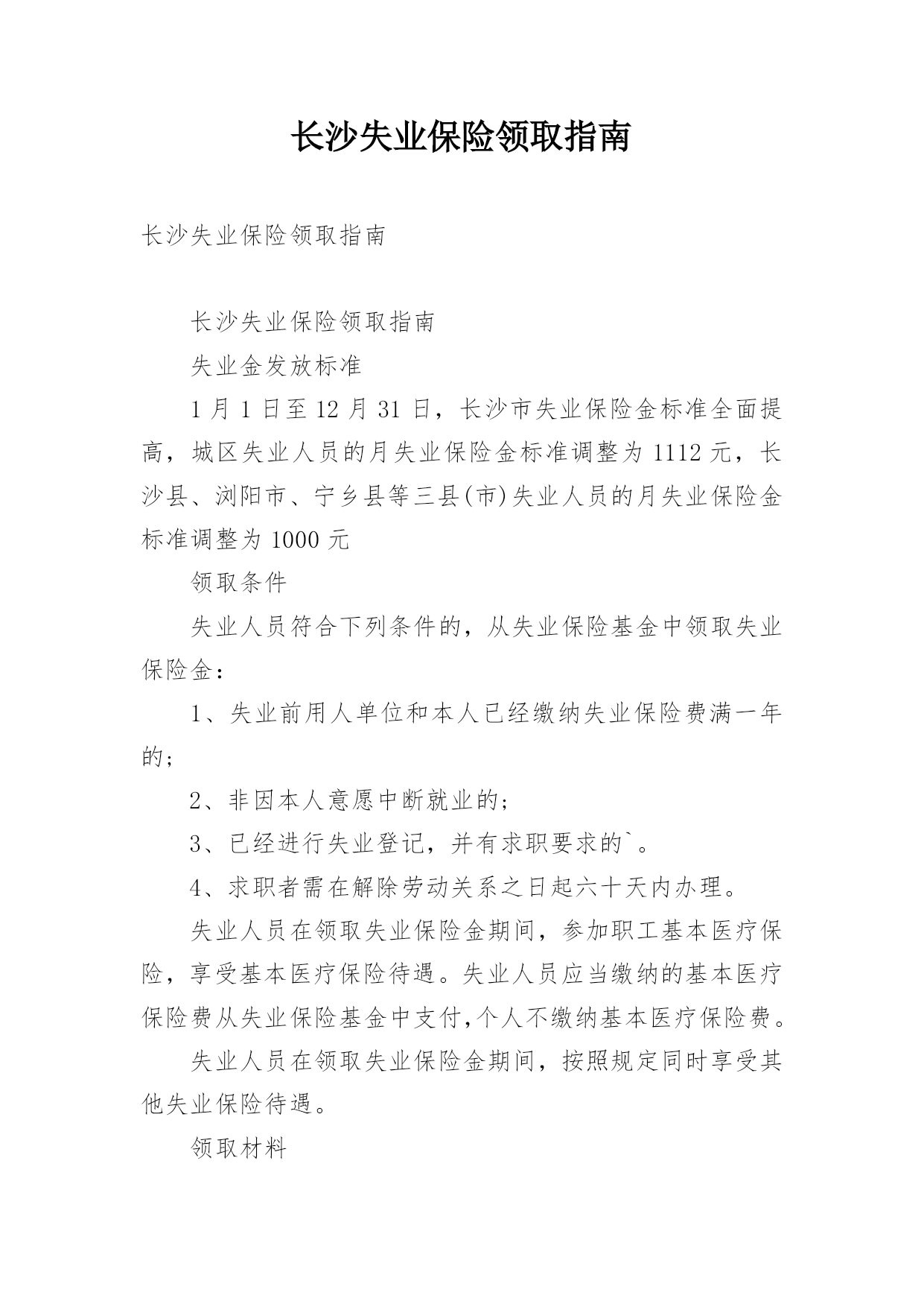 长沙失业保险领取指南长沙失业保险领取指南长沙失业保险领取指南失业金发放标准1月1日至12月31日,长沙市失业保险金标准全面提高,城区失业人员的月失业保险金标准调整为1112元,长沙县、浏阳市、宁乡县等三县(市)失业人员的月失业保险金标准调整为1000元领取条件失业人员符合下列条件的,从失业保险基金中领取失业保险金:1、失业前用人单位和本人已经缴纳失业保险费满一年的;2、非因本人意愿中断就业的;3、已经进行失业登记,并有求职要求的`。4、求职者需在解除劳动关系之日起六十天内办理。失业人员在领取失业保险金期间