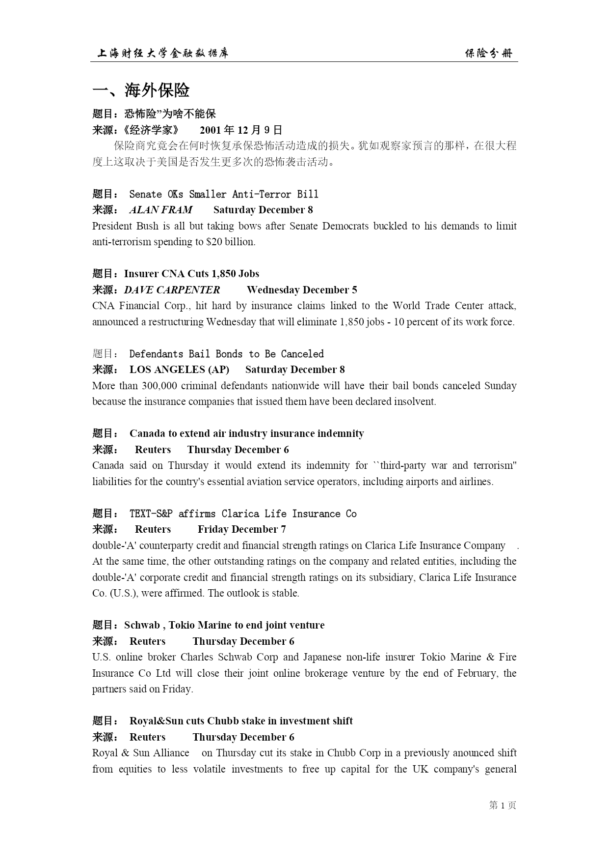 上海财经大学金融数据库保险分册第PAGE8页一、海外保险题目:恐怖险”为啥不能保来源:《经济学家》2001年12月9日保险商究竟会在何时恢复承保恐怖活动造成的损失。犹如观察家预言的那样,在很大程度上这取决于美国是否发生更多次的恐怖袭击活动。题目:SenateOKsSmallerAnti-TerrorBill来源:ALANFRAMSaturdayDecember8PresidentBushisallbuttakingbowsafterSenateDemocratsbuckledtohisdemands