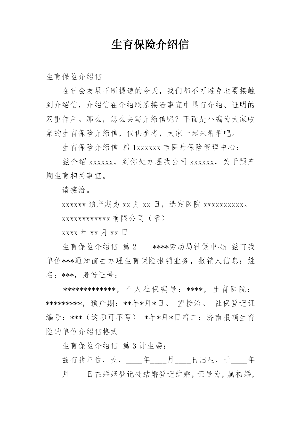 生育保险介绍信生育保险介绍信在社会发展不断提速的今天,我们都不可避免地要接触到介绍信,介绍信在介绍联系接洽事宜中具有介绍、证明的双重作用。那么,怎么去写介绍信呢?下面是小编为大家收集的生育保险介绍信,仅供参考,大家一起来看看吧。生育保险介绍信篇1xxxxxx市医疗保险管理中心:兹介绍xxxxxx,到你处办理我公司xxxxxx,关于预产期生育相关事宜。请接洽。xxxxxx预产期为xx月xx日,选定医院xxxxxxxxxx。xxxxxxxxxxxx有限公司(章)xxxx年xx月xx日生育保险介绍信篇2****