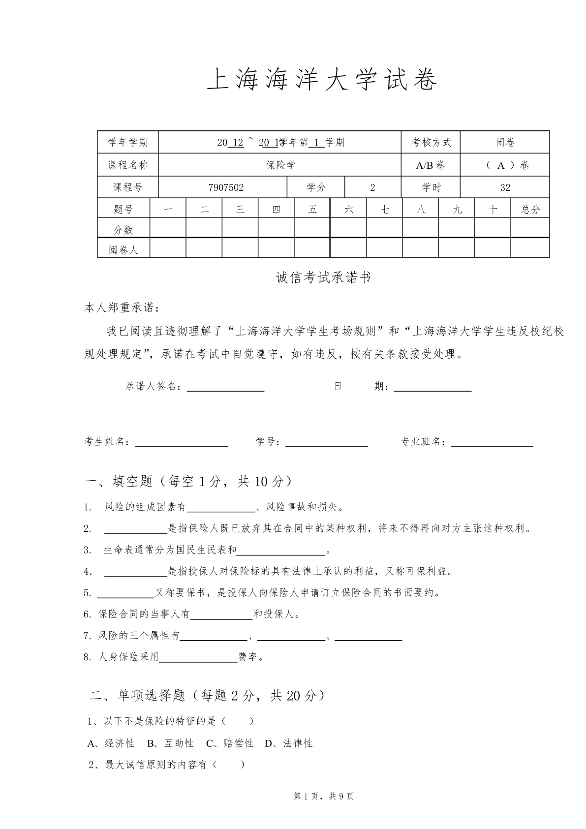 上海海洋大学试卷学年学期2012~2013学年第1学期考核方式闭卷课程名称保险学A/B卷(A)卷课程号7907502学分2学时32题号一二三四五六七八九十总分分数阅卷人诚信考试承诺书本人郑重承诺:我已阅读且透彻理解了“上海海洋大学学生考场规则”和“上海海洋大学学生违反校纪校规处理规定”,承诺在考试中自觉遵守,如有违反,按有关条款接受处理。承诺人签名:日期:考生姓名:学号:专业班名:一、填空题(每空1分,共10分)1.风险的组成因素有、风险事故和损失。2.是指保险人既已放弃其在合同中的某种权利,将来不得再向