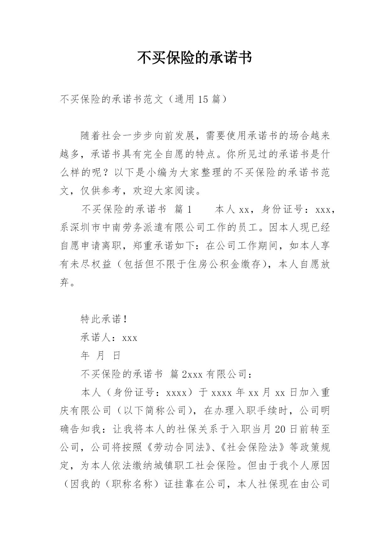 不买保险的承诺书不买保险的承诺书范文(通用15篇)随着社会一步步向前发展,需要使用承诺书的场合越来越多,承诺书具有完全自愿的特点。你所见过的承诺书是什么样的呢?以下是小编为大家整理的不买保险的承诺书范文,仅供参考,欢迎大家阅读。不买保险的承诺书篇1本人xx,身份证号:xxx,系深圳市中南劳务派遣有限公司工作的员工。因本人现已经自愿申请离职,郑重承诺如下:在公司工作期间,如本人享有未尽权益(包括但不限于住房公积金缴存),本人自愿放弃。特此承诺!承诺人:xxx年月日不买保险的承诺书篇2xxx有限公司:本人(身