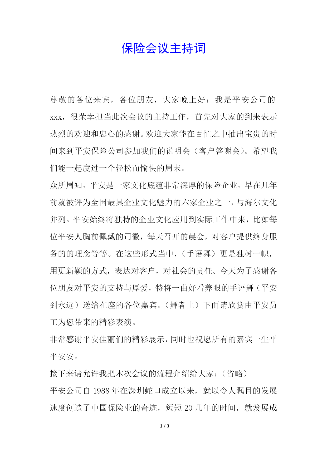 PAGE3/NUMPAGES3保险会议主持词尊敬的各位来宾,各位朋友,大家晚上好;我是平安公司的xxx,很荣幸担当此次会议的主持工作,首先对大家的到来表示热烈的欢迎和忠心的感谢。欢迎大家能在百忙之中抽出宝贵的时间来到平安保险公司参加我们的说明会(客户答谢会)。希望我们能一起度过一个轻松而愉快的周末。众所周知,平安是一家文化底蕴非常深厚的保险企业,早在几年前就被评为全国最具企业文化魅力的六家企业之一,与海尔文化并列。平安始终将独特的企业文化应用到实际工作中来,比如每位平安人胸前佩戴的司徽,每天召